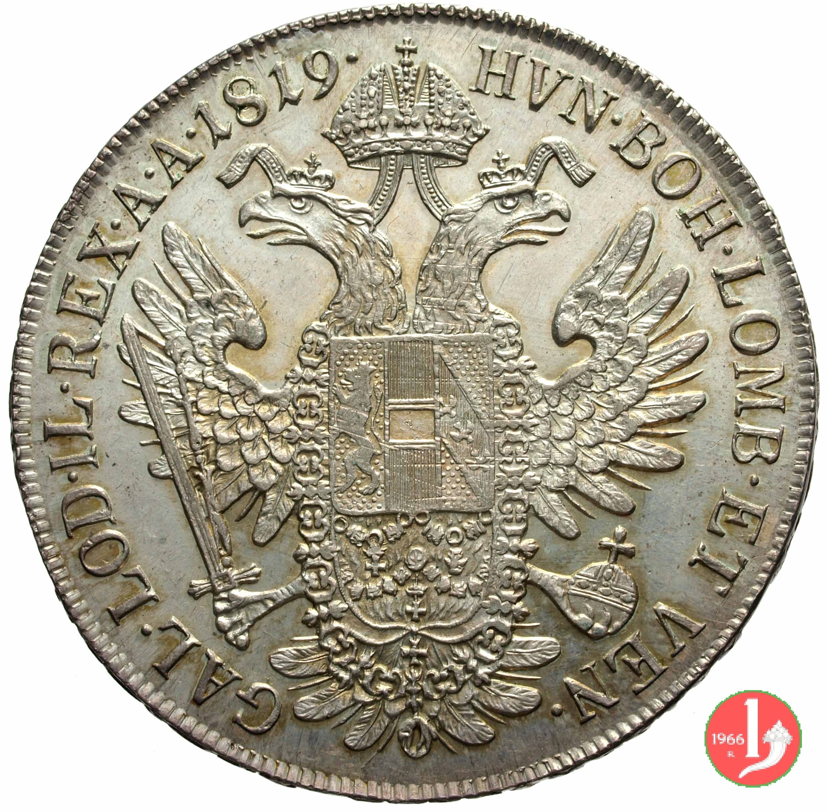 tallero di convenzione Dritto: FRANCISCVS I D G AVSTRIAE IMPERATOR testa laureata a destra, sotto il collo segno di zecca (V per Venezia ed M per Milano). Verso: GAL LOD IL REX A A e data, HVN BOH LOMB ET VEN. Aquila bicipite, sormontata da corona, con stemma degli Asburgo Lorena nel petto; sotto, il valore. | |