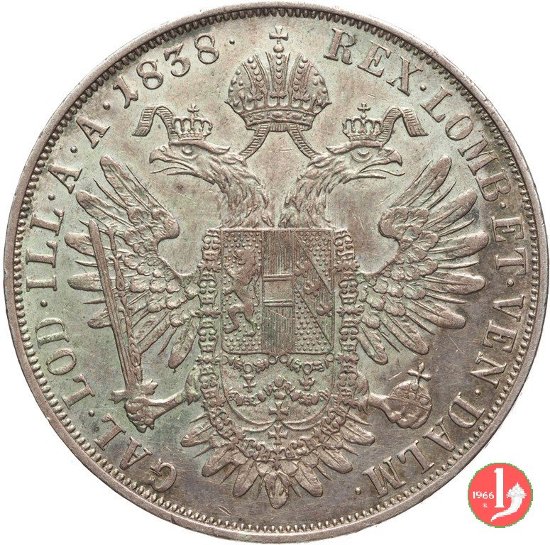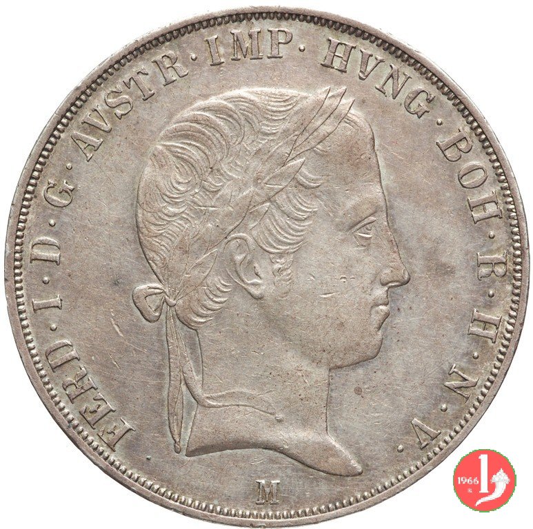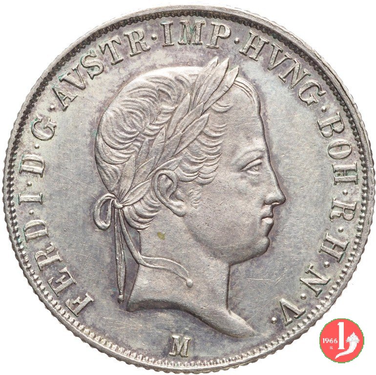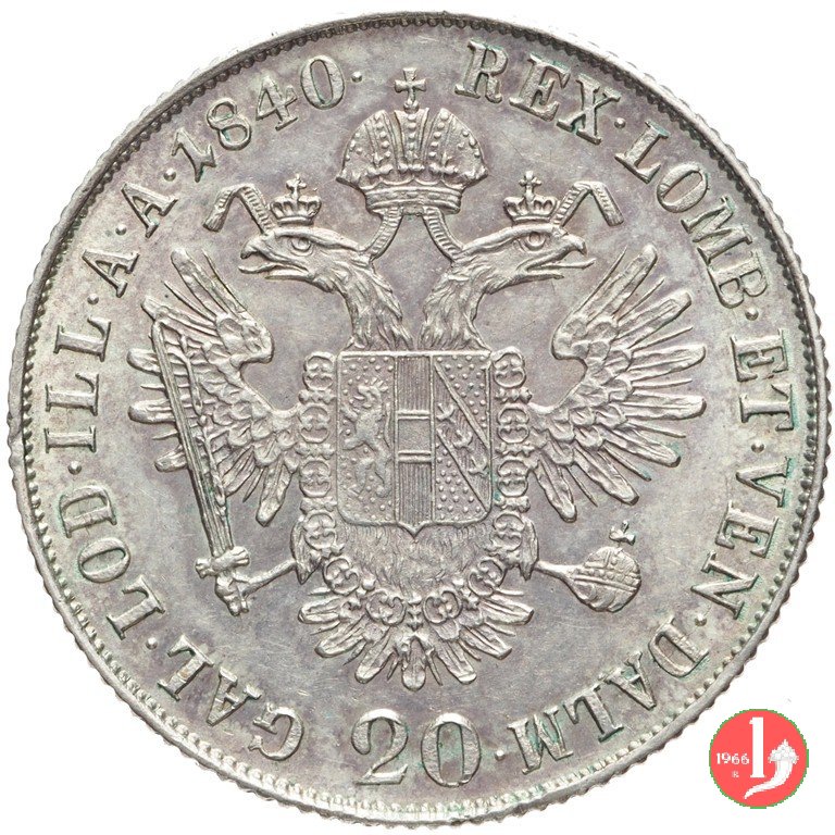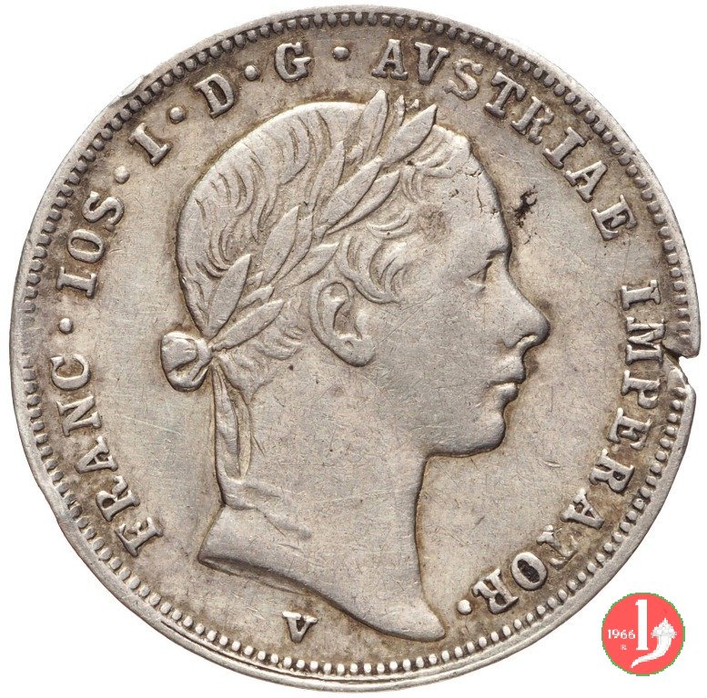 20 Kreuzer Dritto: Testa laureata, a destra. Intorno FERD I D G AVSTR IMP HUNG BOH R H N V • In basso il segno di zecca (M per Milano). Verso: Aquila bicipite dell'Impero Austriaco sormontata da corona imperiale e caricata con lo scudo con i simboli araldici di Milano, Venezia e Austriaco. Intorno REX LOMB ET VEN DALM GAL LOD ILL A A e il millesimo seguito da • In basso il valore: 20 | |