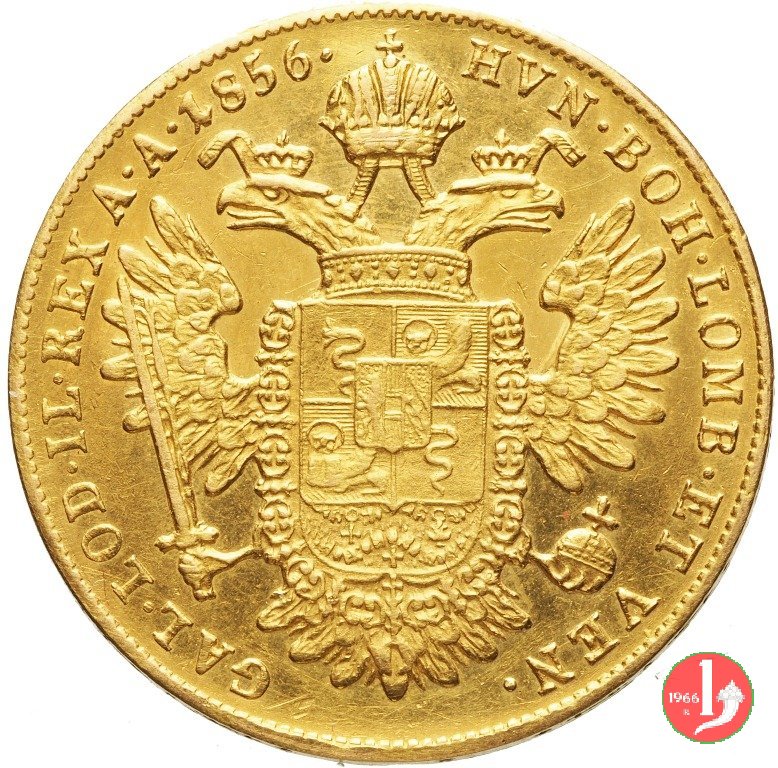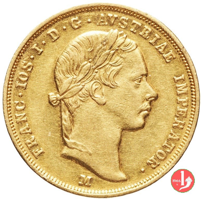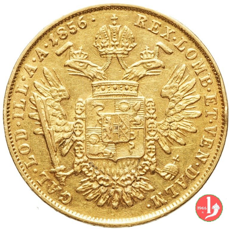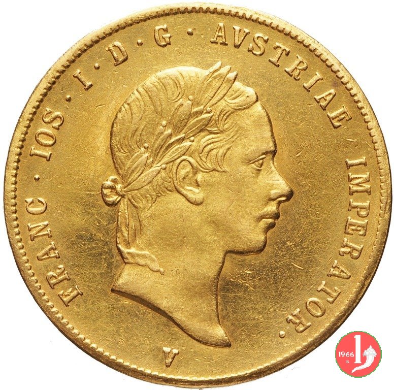 4 Ducati oro Dritto: Busto laureato a destra. Intorno FRANC. IOS. I. D. G. AVSTRIAE IMPERATOR. Sotto segno di zecca (V per Venezia) Verso: Aquila bicipite sormontata da corona imperiale e con lo scudo austriaco. Intorno HVN. BOH. LOMB. ET VEN. GAL. LOD. IL. REX A. A. e millesimo. Sotto, tra parentesi il valore: (4) | |