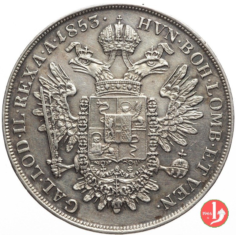 1/2 scudo Dritto: FRANC • IOS • I • D • G • AVSTRIAE IMPERATOR •. In basso il segno di zecca V (per Venezia). Testa laureata a destra. Verso: HVN • BOH • LOMB • ET VEN • GAL • LOD • IL • REX A • A • 1853 • Aquila bicipite sormontata da corona imperiale e con lo scudo con i simboli araldici di Milano e Venezia, caricata al centro dallo stemma d'Asburgo Lorena. | |