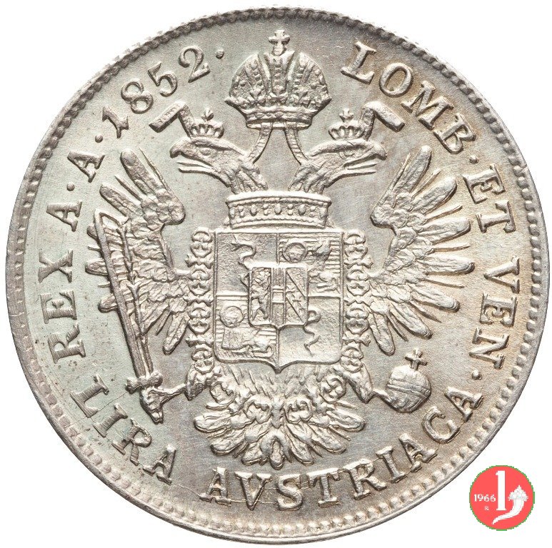Lira Austriaca Dritto: Testa laureata a destra. Nel giro FRANC • IOS • I D • G • AVSTRIAE IMPERATOR •. In basso, sotto il taglio del collo, il segno di zecca (M per Milano, V per Venezia). Verso: Aquila coronata bicipite e caricata dello stemma inquartato di Lombardia e Venezia, con lo scudetto austriaco in cuore. Nel giro LOMB. ET. VEN. - REX. A. A. (millesimo). All'esergo LIRA.AVSTRIACA | |