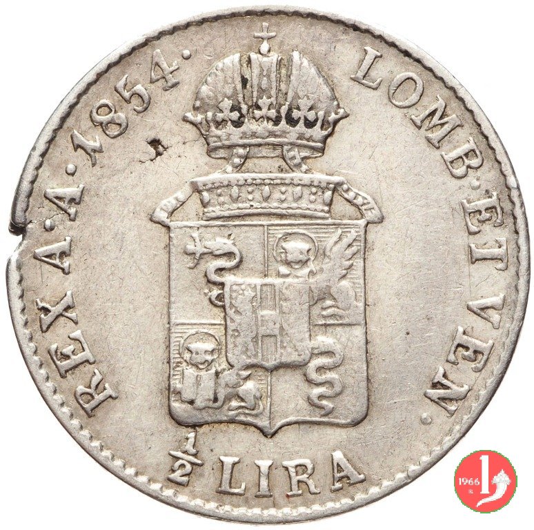 1/2 lira Dritto: FRANC • IOS • I • D • G • AVSTRIAE IMPERATOR •. In basso, sotto il taglio del collo, V (segno di zecca per Venezia). Testa laureata del Re a destra. Verso: LOMB • ET VEN • REX A • A • e il millesimo seguito da •. In basso, 1/2 LIRA (indicazione del valore). Scudo con i simboli araldici di Milano e Venezia, caricato al centro dallo scudetto d'Asburgo e Lorena; sormontato dalla Corona Ferrea e da Imperiale d'Austria. | |