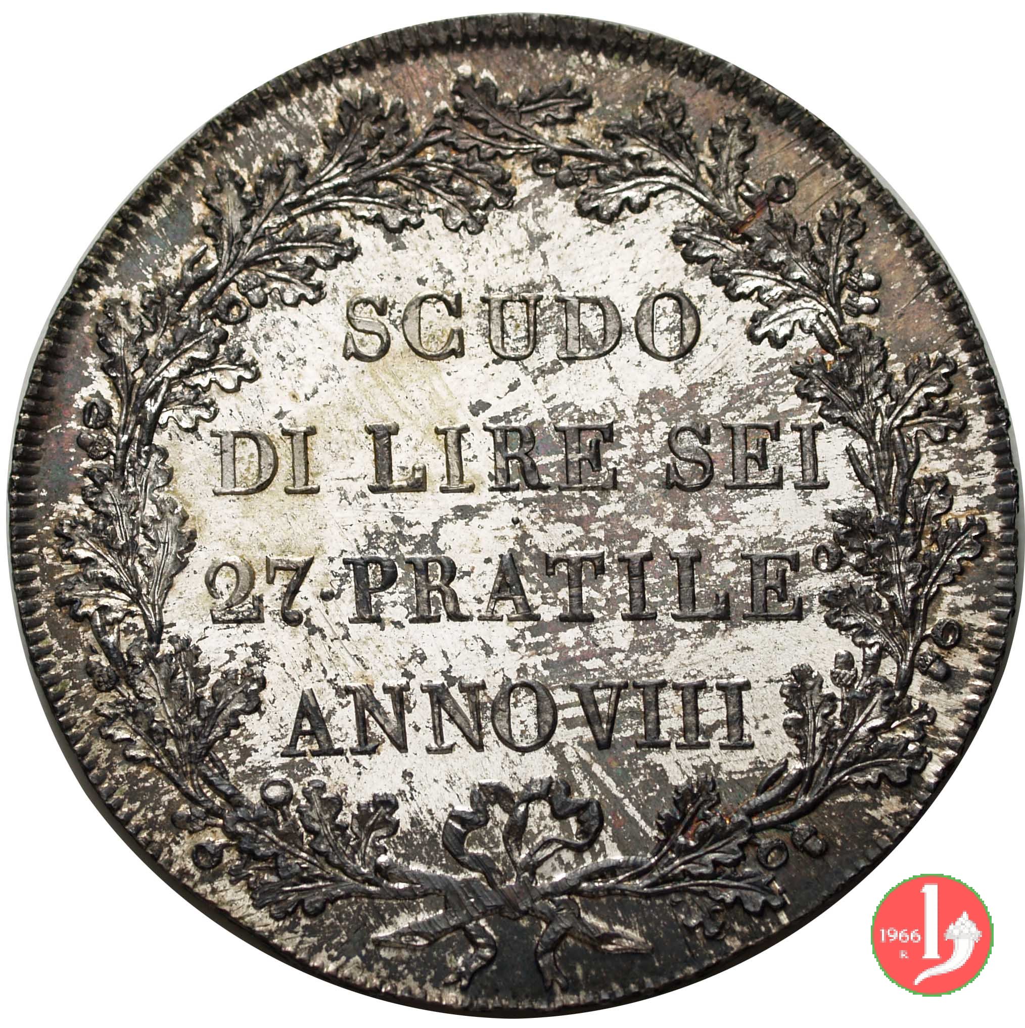 Scudo da 6 Lire Dritto: Figura femminile -allegoria della Repubblica Cisalpina- in piedi volta a sinistra omaggia la Francia seduta. Ai piedi della Repubblica cisalpina, a destra una cicogna (simbolo di devozione) e, a sinistra, una cornucopia (simbolo di abbondanza). Sul basamento del trono della Francia indicazione dell'autore in incuso (SALVIRICH). Intorno, ALLA NAZ • FRAN • LA REP • CISAL • RICONOSCENTE. Verso: Nel campo, su quattro righe, tra due rami di quercia, SCUDO / DI LIRE SEI / 27 • PRATILE / ANNO VIII. | |