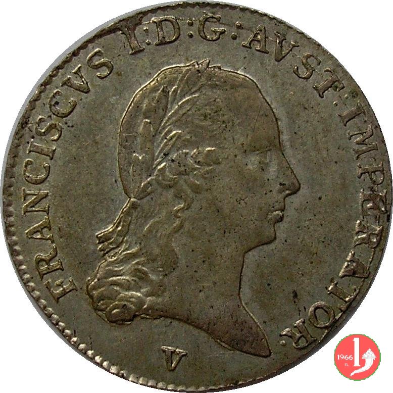 5 kreuzer Dritto: FRANCISCVS I.D.G. AVST. IMPERATOR. Testa laureata a destra entro rami d'alloro, sotto il collo segno di zecca (V). Verso: HVN.BOH.LOMB.ET VEN.GAL.LOD.IL.REX.A.A. e la data. HVN.BOH.LOMB.ET VEN.GAL.LOD.IL.REX.A.A. e data. Aquila bicipite, sormontata da corona, con stemma degli Asburgo Lorena nel petto. Sotto, valore entro cornice a cuore ornata da rami d'olivo e di palma. | |