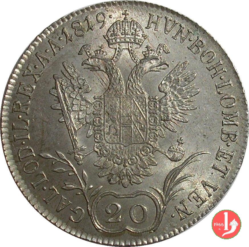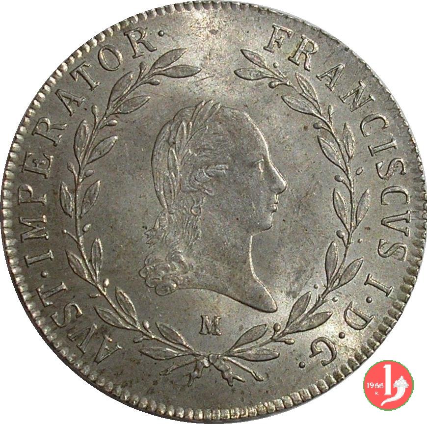 20 kreuzer - I tipo Dritto: FRANCISCVS I • D • G • AVST • IMPERATOR • testa laureata a destra entro rami d'alloro, sotto il collo segno di zecca (M per Milano o V per Venezia). Verso: HVN • BOH • LOMB • ET VEN • GAL • LOD • IL • REX • A • A • e data. Aquila bicipite, sormontata da corona, con stemma degli Asburgo Lorena nel petto. Sotto, valore entro cornice formata da due semiovali ed ornata da rami d'olivo e di palma. | |
