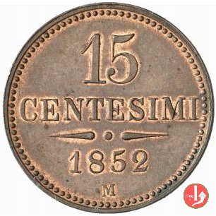 15 centesimi Dritto: Aquila bicipite sormontata da corona imperiale e caricata con lo scudo austriaco. Intorno, nella parte superiore, IMPERO AUSTRIACO. Verso: Indicazione del valore (15 CENTESIMI) su due righe, in basso millesimo separato dal valore da un fregio orizzontale. Sotto segno di zecca (M per Milano, V per Venezia). | |