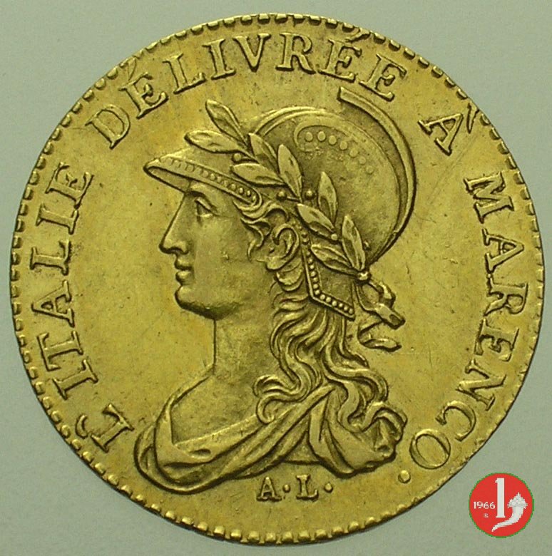 Marengo Dritto: Nel campo, all'interno di una corona di lauro legata alla base con nastro incrociato, 20 - FRANCS (indicazione del valore) su due righe, fregio e L' AN (indicazione del millesimo). Intorno LIBERTÉ, EGALITÈ e ERIDANIA separate da due rosette a sei petali. Verso: Nel campo testa elmata di Atena volta a sinistra, Intorno L'ITALIE DÉLIVRÉE `A MARENCO •. Sotto la testa di Atena, le iniziali dell'incisore A • L •(Amedeo Lavy). Varianti di conio con 'A di primo tipo A' di secondo tipo. | |