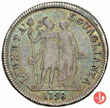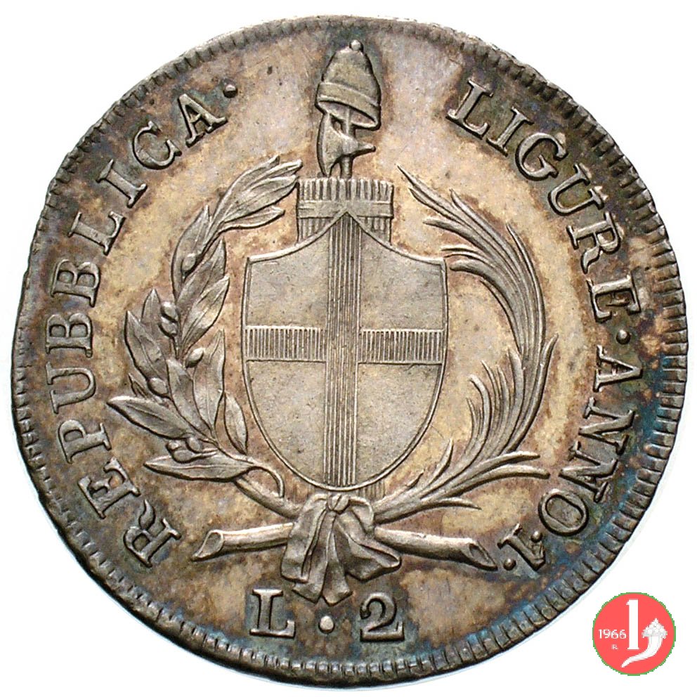 2 lire Dritto: Due figure femminili, allegorie della libertà (con elmo e picca sormontata da berretto frigio) e dell'eguaglianza (con livella); sulla base indicazione dell'autore (H • V • F • per Gerolamo Vassallo Fecit) in incuso. In esergo indicazione del millesimo (1798). Intorno LIBERTÀ EGUAGLIANZA. Verso: Stemma ovale caricato su fascio con scure sormontato da berretto frigio e tra due rami di palma (a destra) e lauro (a sinistra) legati da un nastro. Intorno, REPUBBLICA • LIGURE • ANNO • I •. In basso indicazione del valore (L • 2). | |