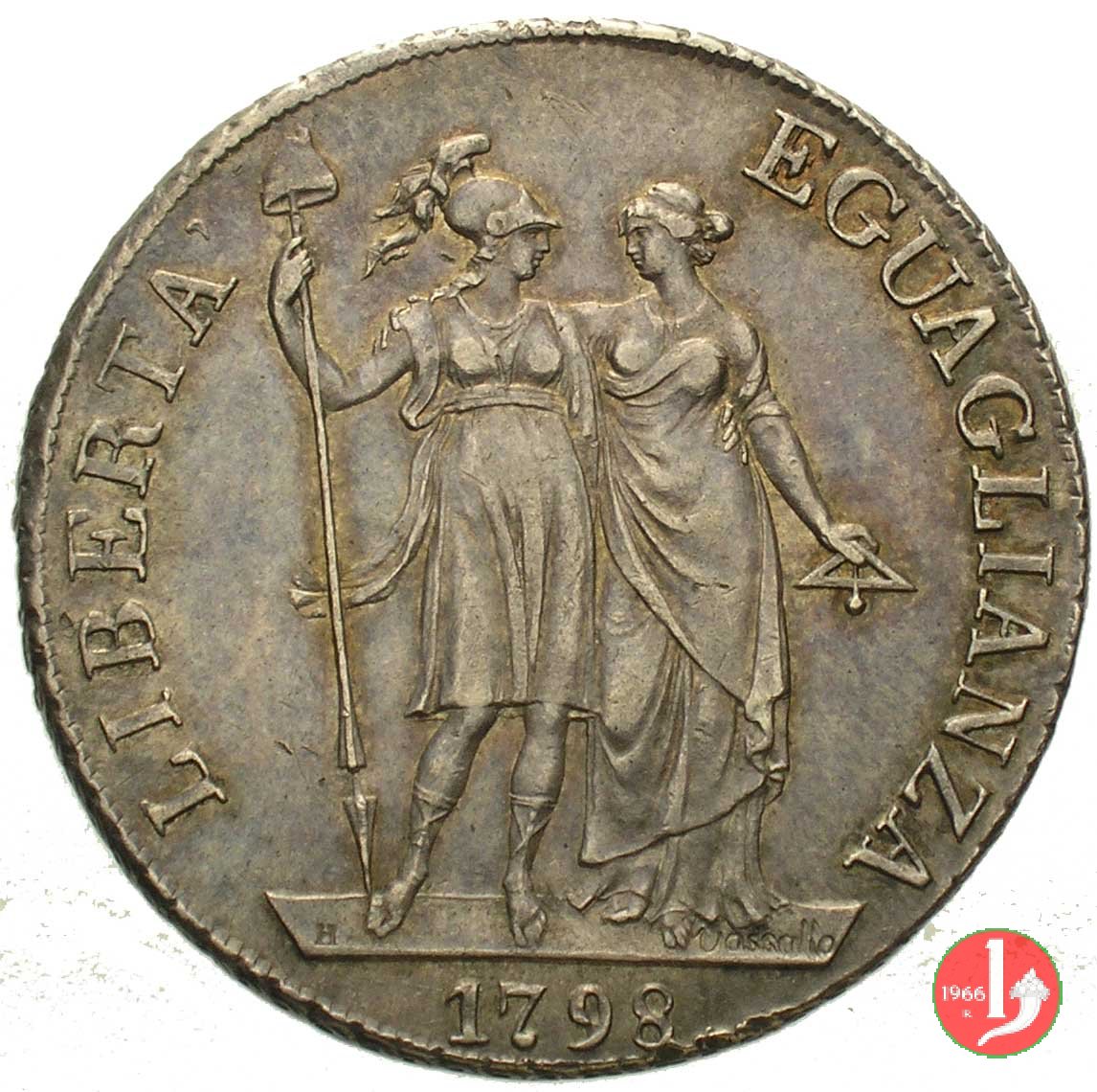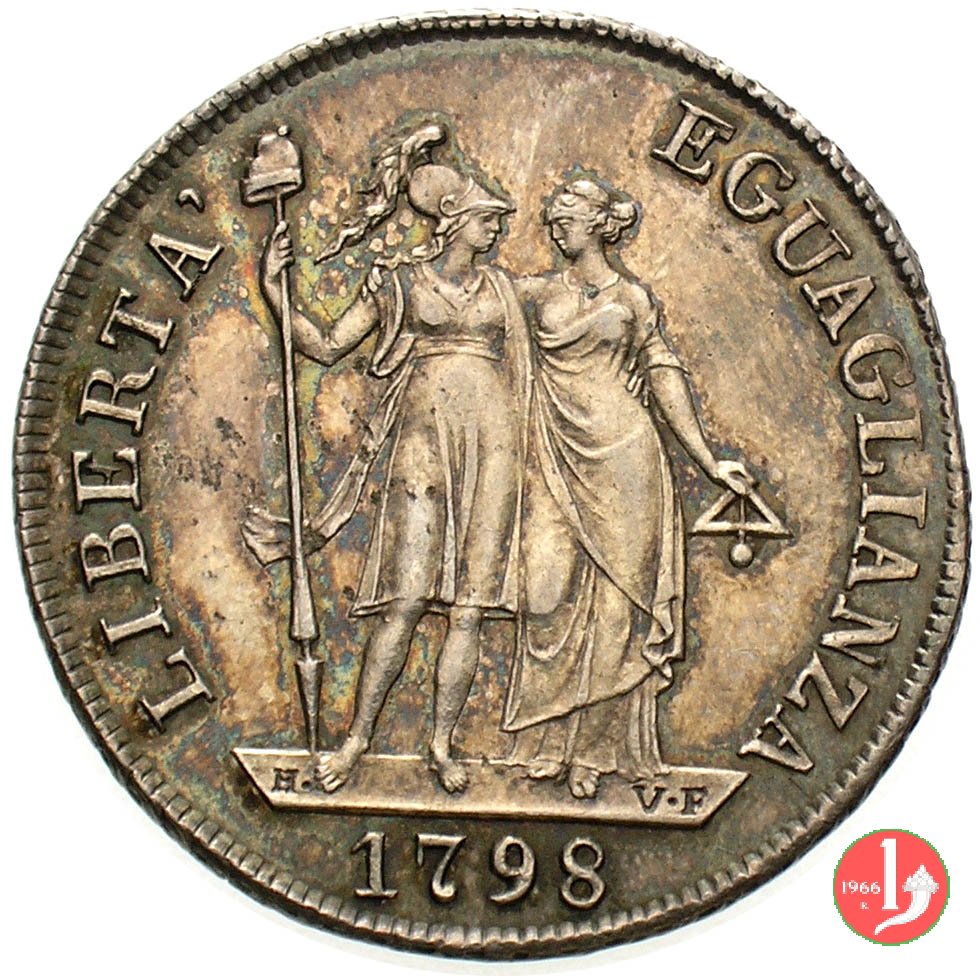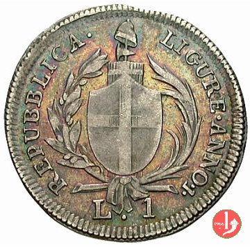 1 lira Dritto: Due figure femminili, allegorie della libertà (con elmo e picca sormontata da berretto frigio) e dell'eguaglianza (con livella); sulla base indicazione dell'autore (H • V • F • per Gerolamo Vassallo Fecit) in incuso. In esergo indicazione del millesimo (1798). Intorno LIBERTÀ EGUAGLIANZA. Verso: Stemma ovale caricato su fascio con scure sormontato da berretto frigio e tra due rami di palma (a destra) e lauro (a sinistra) legati da un nastro. Intorno, REPUBBLICA • LIGURE • ANNO • I •. In basso indicazione del valore (L • 1). | |