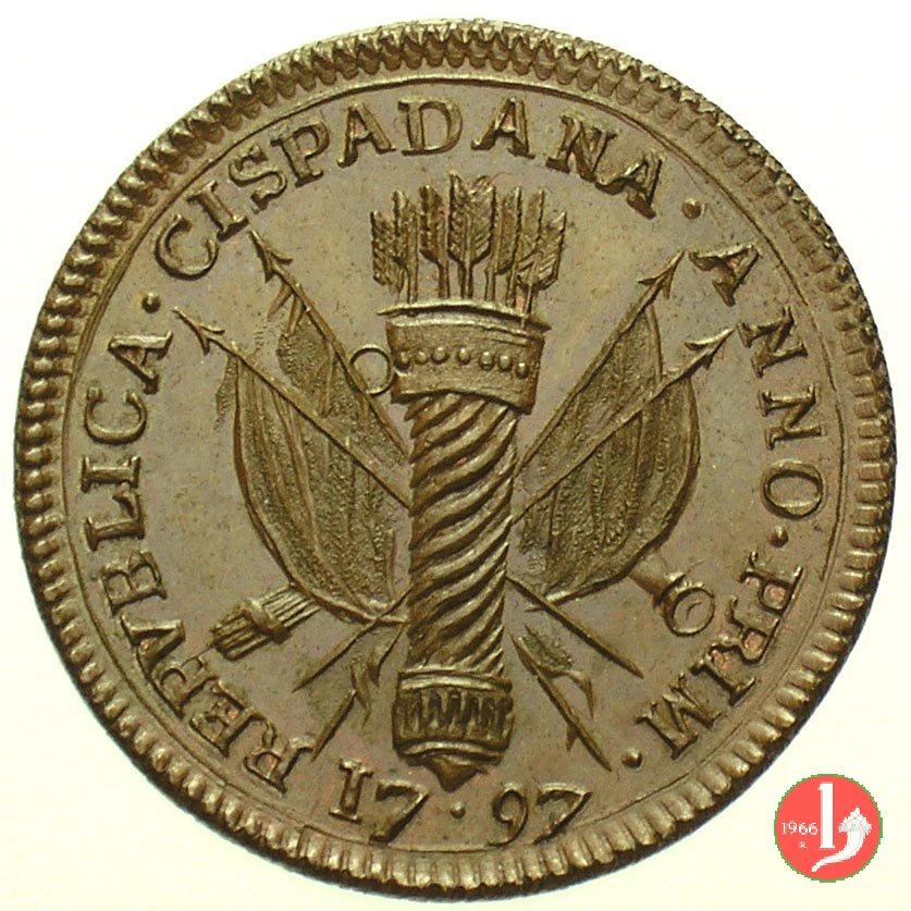 Doppia Dritto: RESPVBBLICA • CISPADANA • ANNO • PRIM •, nel campo turcasso con quattro frecce posto su quattro bandiere decussate ed armi, sotto 17 • 97. Verso: PRAESIDIVM • ET • DECVS •, busto della madonna di San Luca con in braccio il Bambin Gesú posta su nubi, all'esergo e volto verso il campo BONONIA •. | |