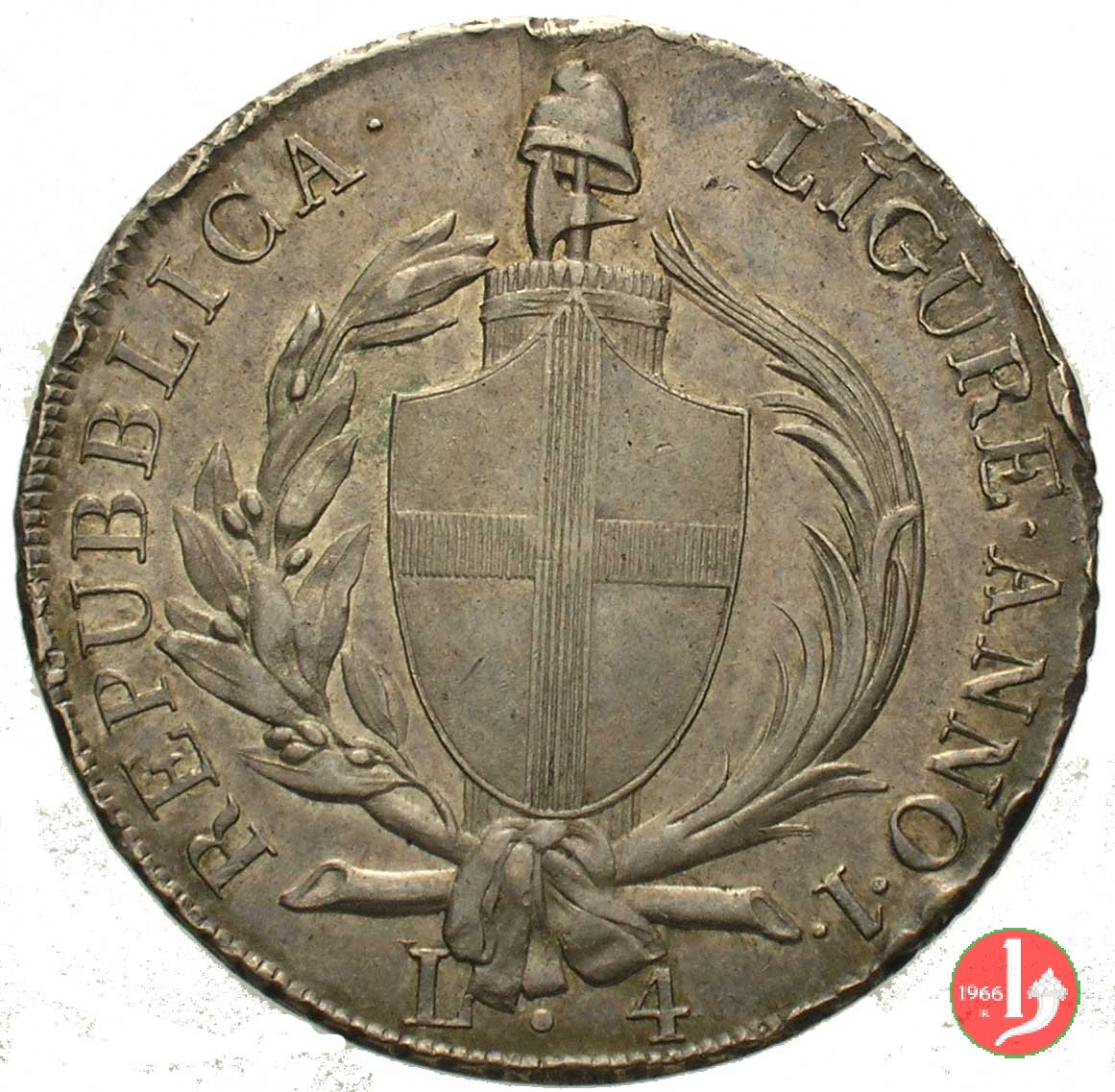 4 lire Dritto: Due figure femminili, allegorie della libertà (con elmo e picca sormontata da berretto frigio) e dell'eguaglianza (con livella); sulla base indicazione dell'autore (H • VASSALLO) in incuso. In esergo indicazione del millesimo, intorno LIBERTÀ EGUAGLIANZA. Verso: Stemma ovale caricato su fascio con scure sormontato da berretto frigio e tra due rami di palma (a destra) e lauro (a sinistra) legati da un nastro. Intorno, REPUBBLICA • LIGURE • ANNO •, indicazione dell'anno repubblicano e •. In basso indicazione del valore (L • 4). |