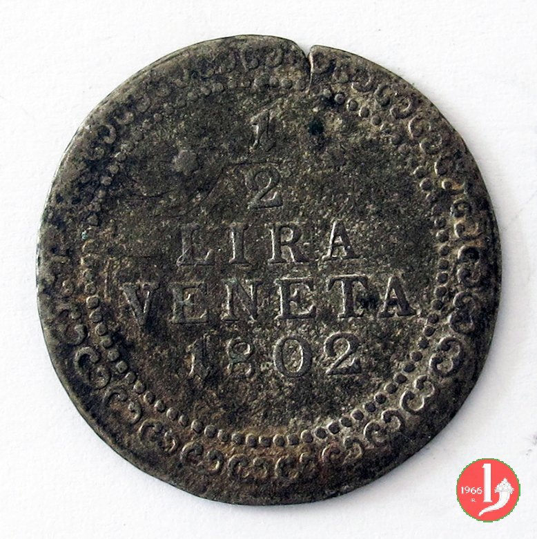 1/2 lira Dritto: All'interno di un cerchio di perline e di un ornato, indicazione del valore e millesimo (1/2 tra due rosette e LIRA VENETA 1802). Verso: All'interno di un cerchio di perline, aquila araldica bicipite e coronata con spade dell'Impero Austriaco. Intorno, FRANC • II • D •G • R • I • S • A • GE • HV • BO • REX • A • A • D • VENET • e tre rosette. | |