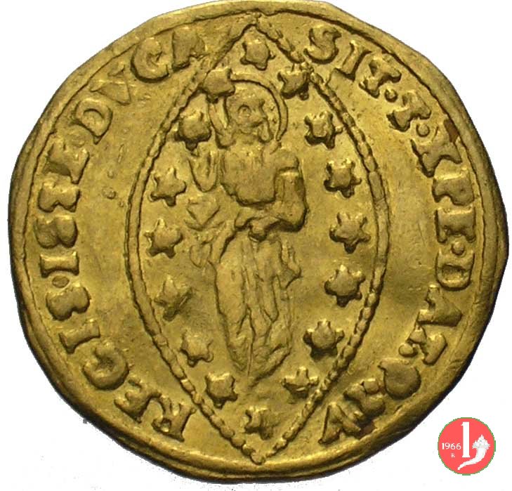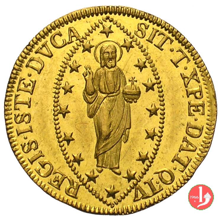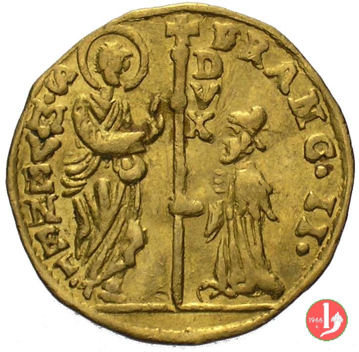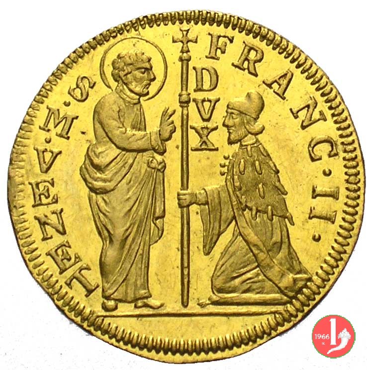 Zecchino di primo tipo con Vangelo Dritto: San Marco stante a sinistra benedice il Doge,di fronte e genuflesso. Al centro asta sormontata da croce e retta dal Doge con la destra. Nel giro, FRANC • II • S • M • VENET • e -lungo l'asta del vessillo- D/V/X •. Verso: Il Redentore stante di fronte,con il Vangelo entro aureola ellittica a mandorla cosparsa di 7 stelle a destra, 7 a sinistra, una sopra ed una sotto ai piedi. Nel giro SIT • T • XPE • DAT • Q • TV - REGIS • ISTE • DVCA. | |