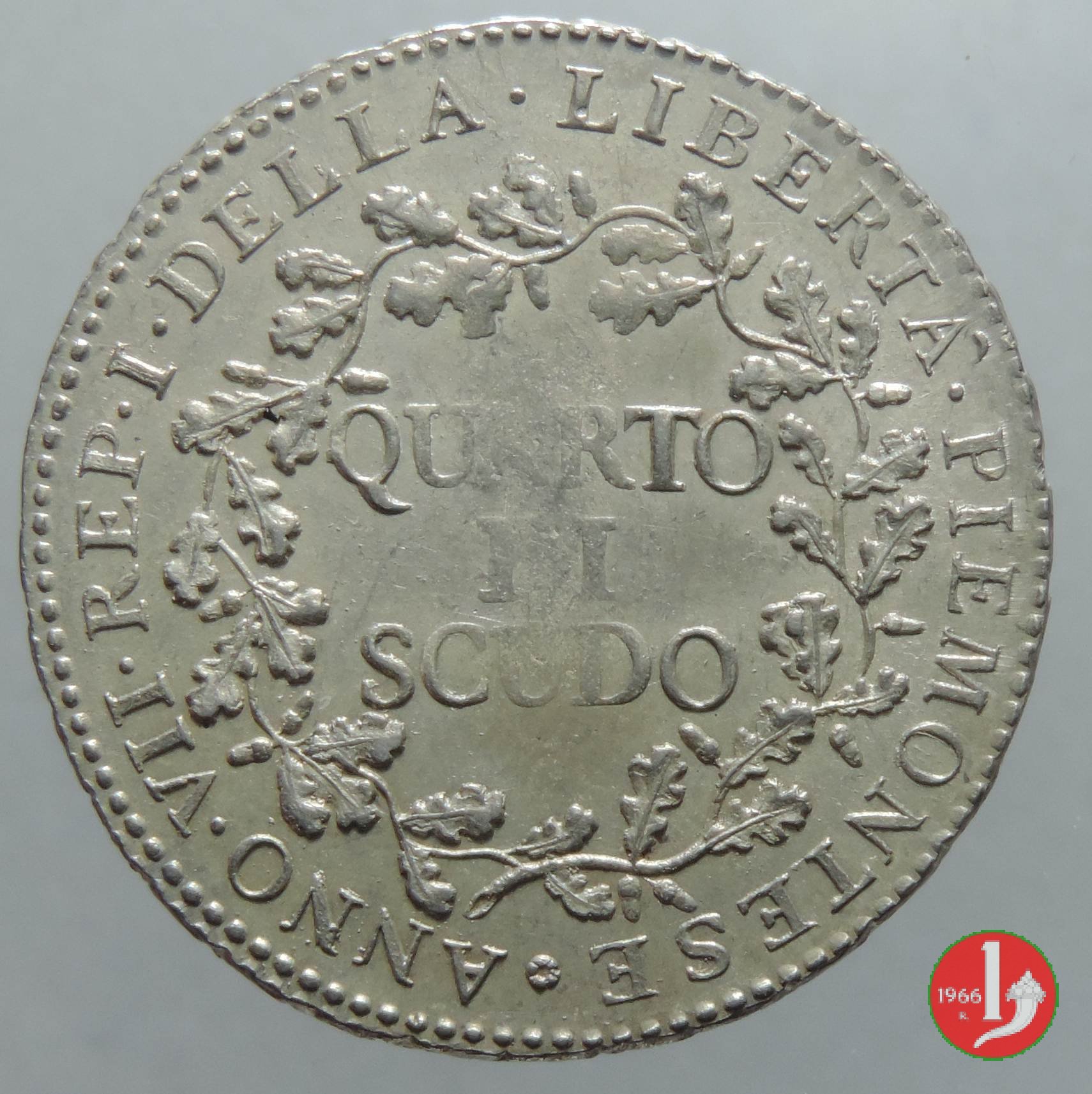 Quarto di scudo Dritto: ANNO • VII • REP • I • DELLA • LIBERTÀ • PIEMONTESE e una rosetta a sei petali. Nel campo tra rami di quercia, su tre righe QUARTO / DI / SCUDO (indicazione del valore) Verso: LIBERTÀ • VIRTÚ • EGUAGLIANZA •,figura allegorica della Gallia Subalpina con fascio con scure e e pileo. | |
