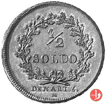 1/2 soldo Dritto: Bilancia a due bracci sovrapposta ad un ramo di palma e spada che si incrociano legati da un nastro, intorno REPUBBLICA ITALIANA. In basso indicazione del millesimo (1804 • III •). Verso: Indicazione del valore (MEZZO SOLDO oppure 1/2 SOLDO) all'interno di due rami di quercia incrociati e legati con un nastro. In esergo indicazione del valore (DENARI • 5 •) sotto al quale si trova il segno di zecca (M). | |
