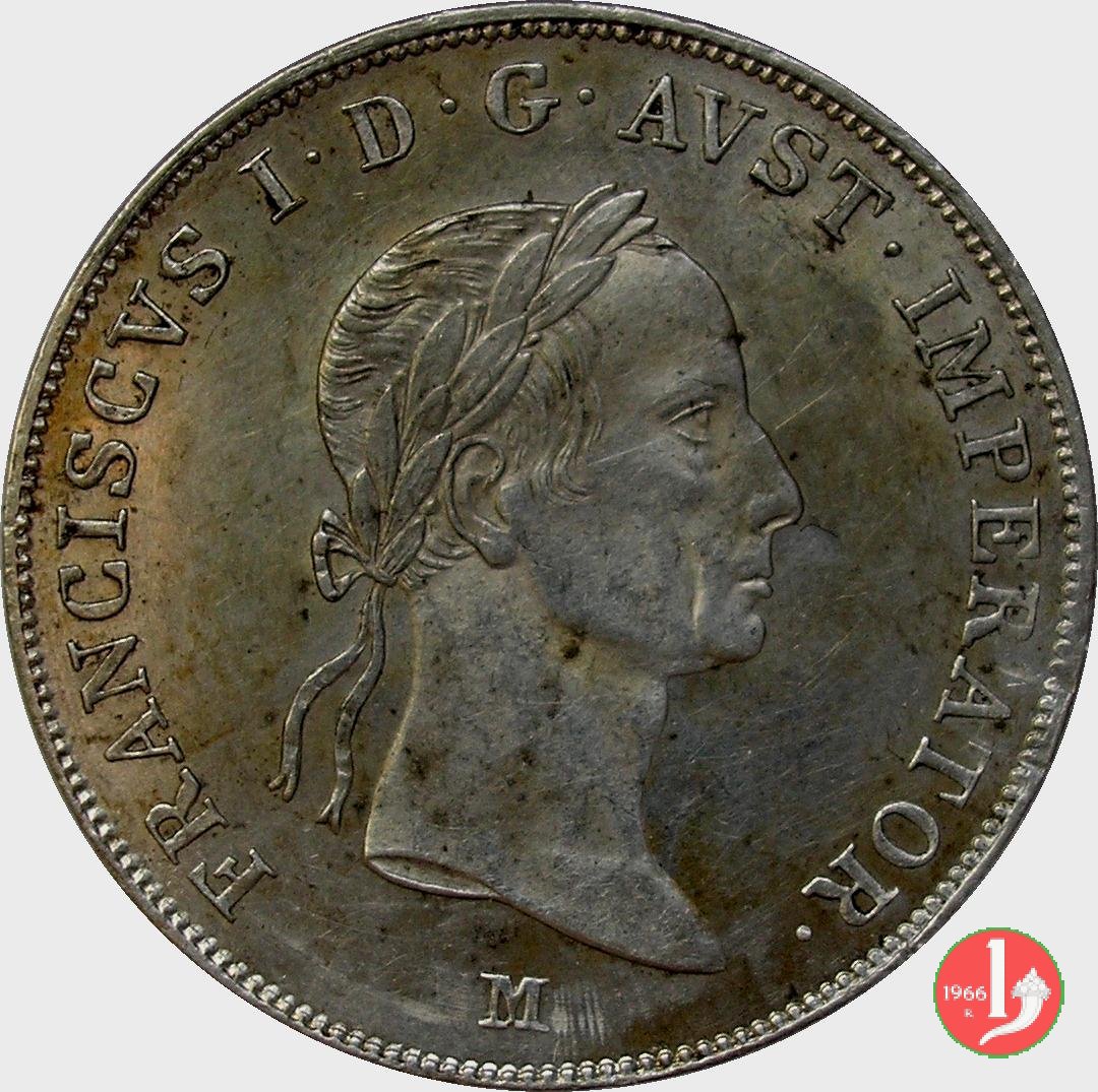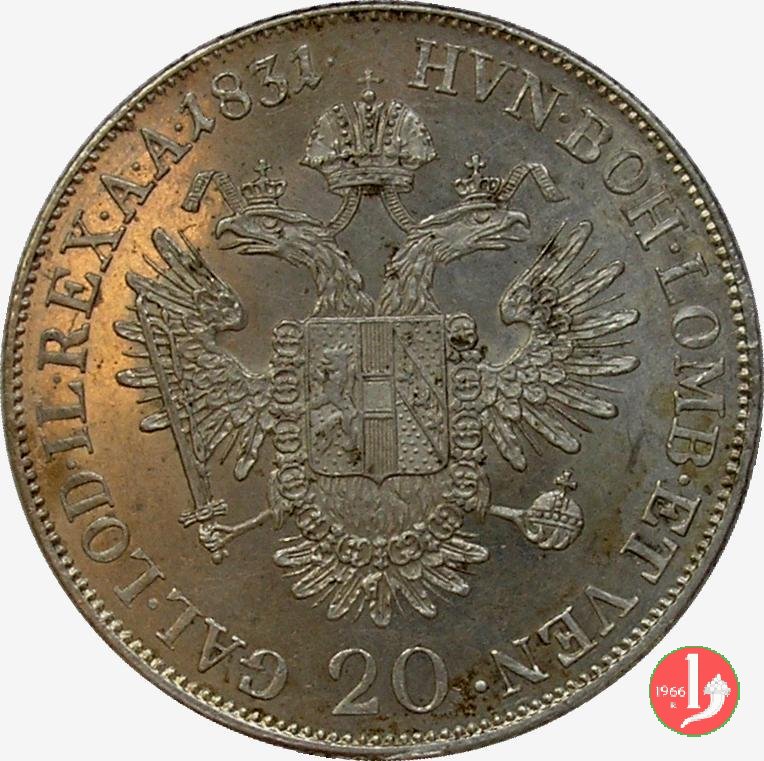 20 kreuzer - II tipo Dritto: FRANCISCVS I • D • G • AVST • IMPERATOR • Testa laureata a destra, sotto il collo segno di zecca (M per Milano o V per Venezia). Verso: GAL • LOD • IL • REX • A • A • e data, HVN • BOH • LOMB • ET VEN. Aquila bicipite, sormontata da corona, con stemma degli Asburgo Lorena nel petto; sotto, il valore. | |