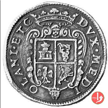Verso: Scudo coronato inquartato dei tre gigli di Francia e del Biscione. Dietro, in secondo piano, Sant'Ambrogio seduto di fronte nimbato, con staffile e pastorale.