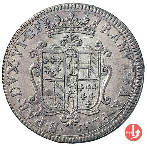Dritto: Busto di Ranuccio II con corazza e gorgiera volto a sinistra, intorno RAN • FAR • PLA • E • PAR • DVX  VI •