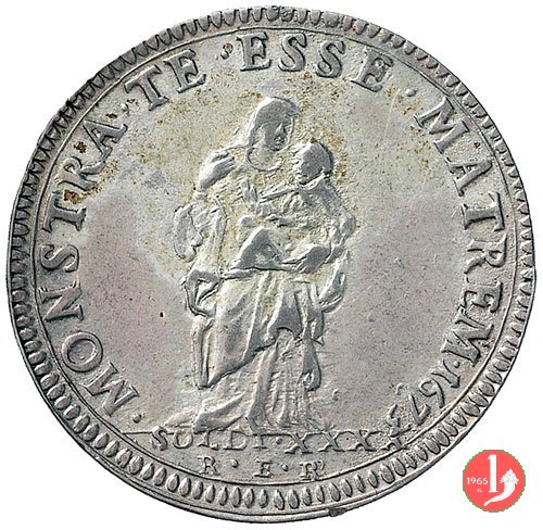 Verso: Figura della Madonna con bambino in piedi, intorno  • MONSTRA • TE • ESSE • MATREM •, millesimo e •. In esergo indicazione del valore (SOLDI XXXX) e sigla dello zecchiere.