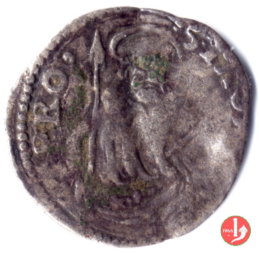 Verso: All'interno di un cerchio di perline, unicorno volto a destra mentra scaccia con il corno dei serpenti dall'acqua, sopra un giglio. Intorno ET • SIBI • ET • ALIIS •. In esergo sigla dello zecchiero Elia Tiseo ( • E • T • ).
