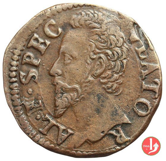 Dritto: Busto corazzato con spallaccio leonino del Duca a sinistra, intorno RAN • FAR • PAR • ET • PLA • DVX • VI. Sotto il busto sigla dello zecchiero.