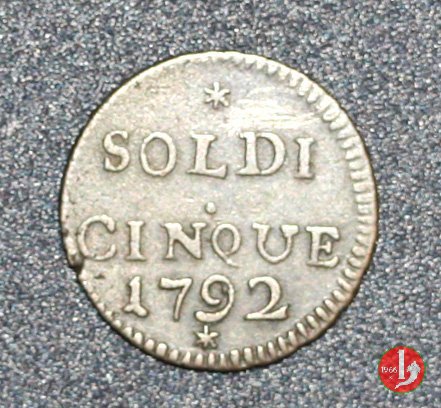 Dritto: Indicazione del valore (SOLDI DIECI) su due righe, sotto il millesimo. Intorno una ghirlanda di foglie.