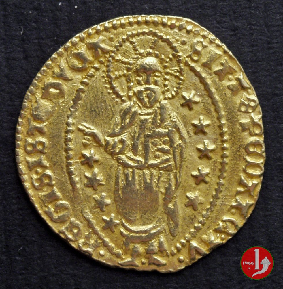 Il Salvatore a sinistra benedicente il Doge inginocchiato che tiene il vessillo in cerchio lineare. In esergo la data.