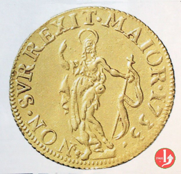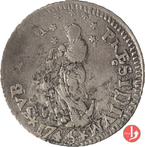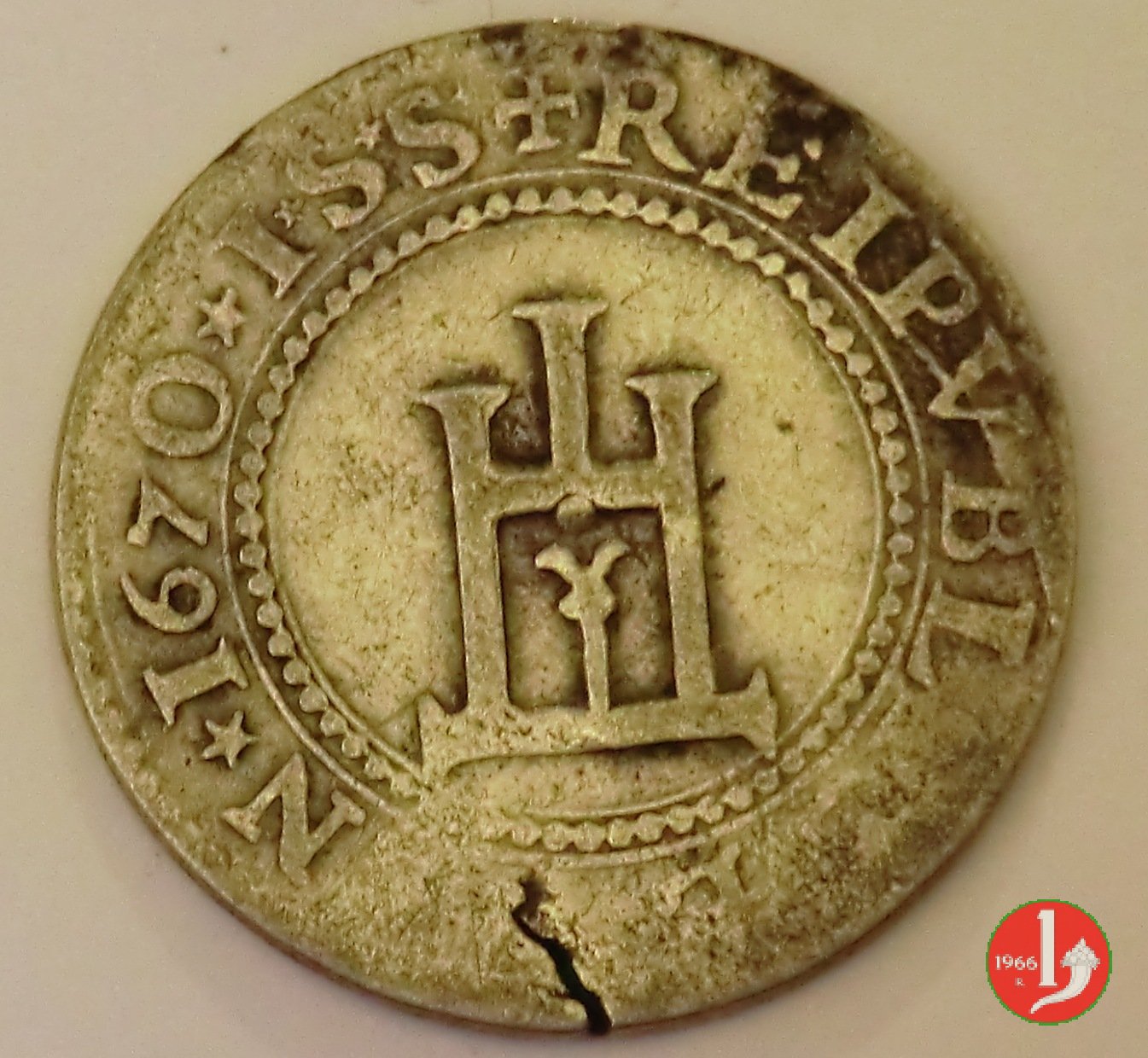 Stemma con sopra la corona regia, con scritto LIBERTAS in banda trasversale, tra 2 grifi sopra due rami; cerchio perlinato. All'esergo stella a 5 punte 1668 stella a 5 punte