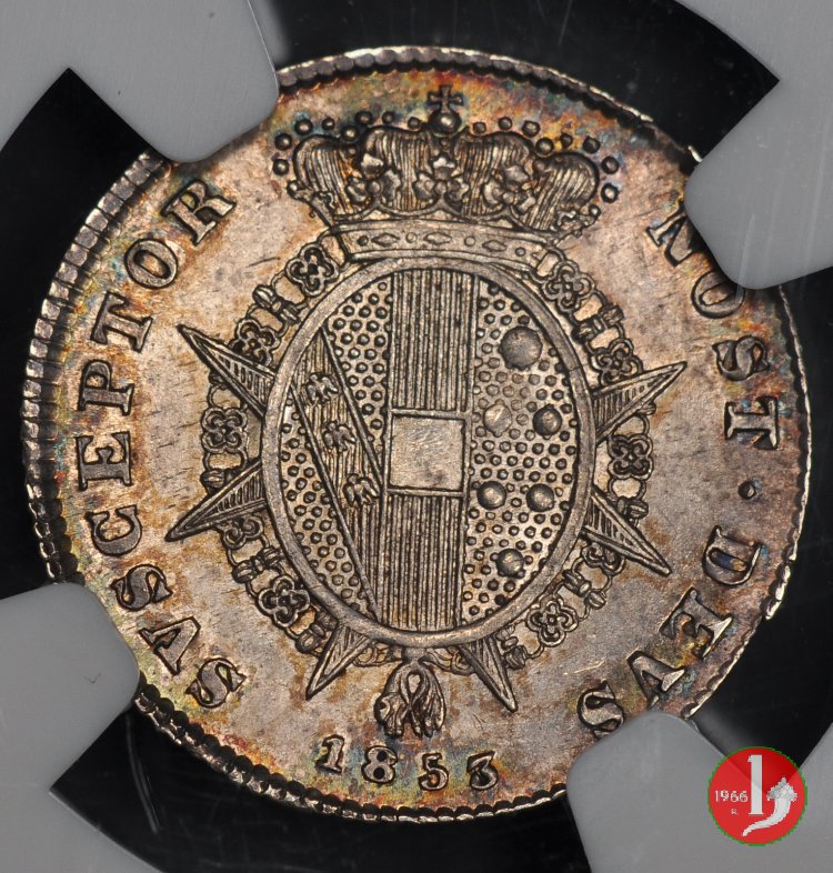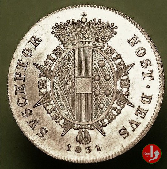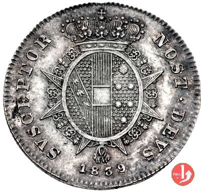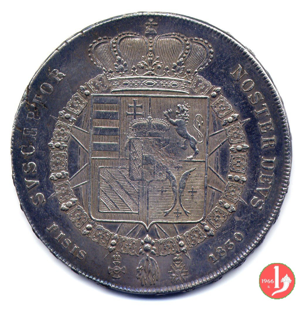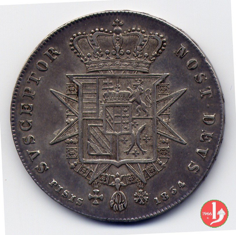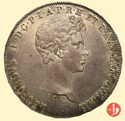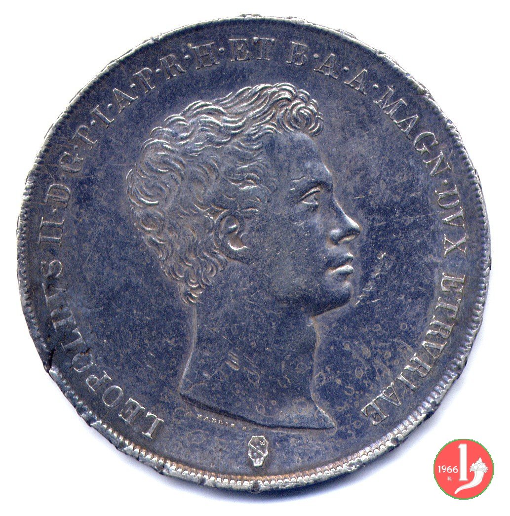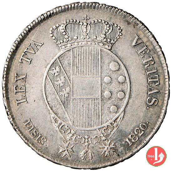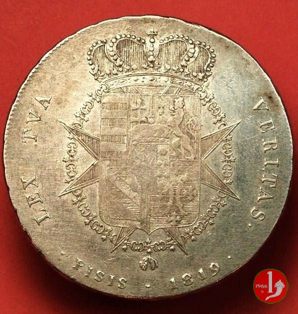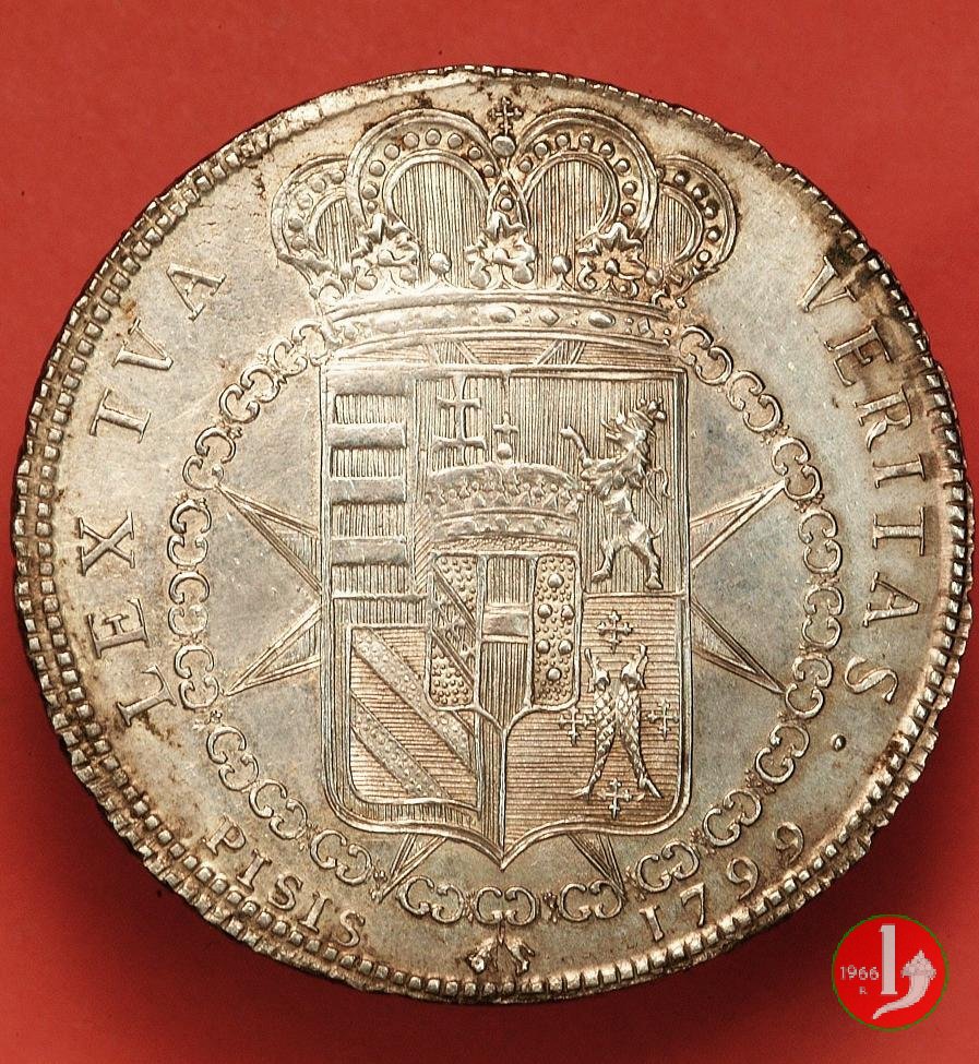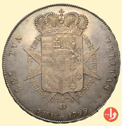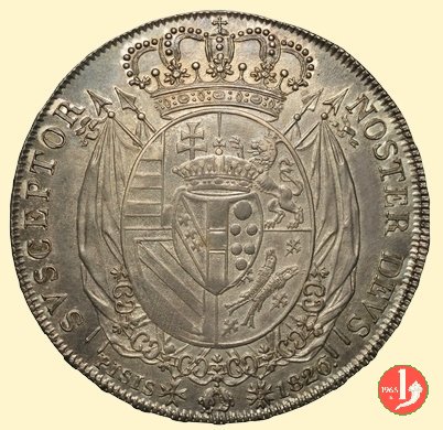 Verso: (da sinistra) LEX TVA VERITAS • stemma di forma sannitica coronato, inquartato e coronato, inquartato e caricato di scudetto partito di Lorena, Austria e Toscana, circondato dal collare del Toson d'oro sovrapposto alla croce di S.Esergo PISIS (anno in cifre)