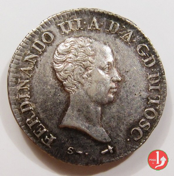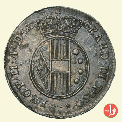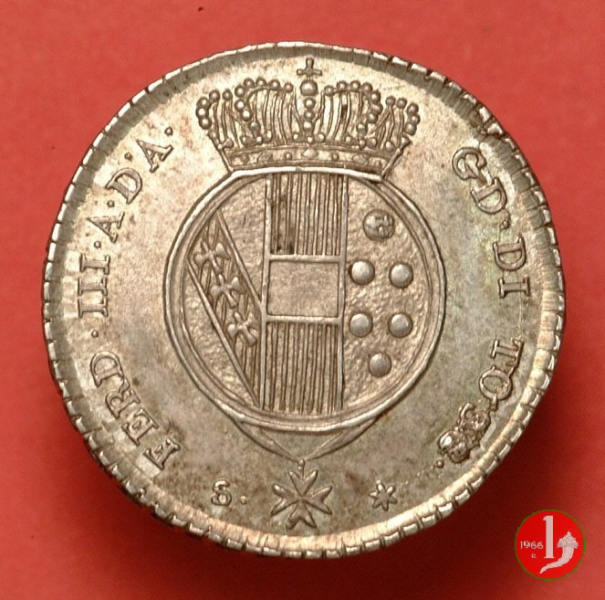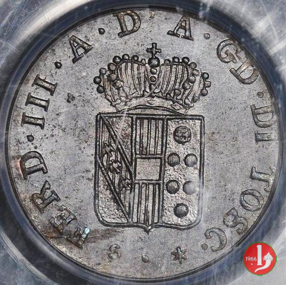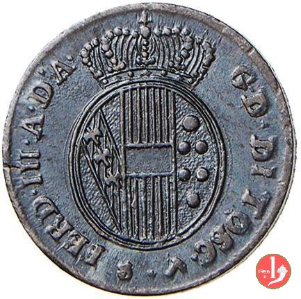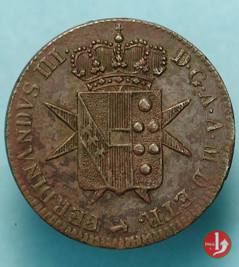 Dritto: (da sinistra) FERD. III • A • D'A • G-D • DI TOSC • stemma sannitico coronato e partito di Borbone e Toscana