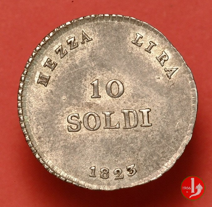 Verso: (da sinistra in alto)MEZZA LIRA nel campo , su due righe 10 SOLDI