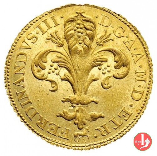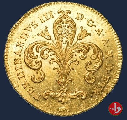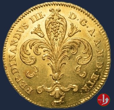 Dritto: (da sinistra) FERDINANDVS III • D • G • A • A • M • D • ETR • il giglio di Firenze con 2 fiori