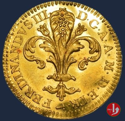 Dritto: (da sinistra) FERDINANDVS III D • G • A • A • M • D • ETR • stemma partito: 1° i tre gigli e 2° le sei palle, coronato e circondato dal toson d'oro, sovrapposto alla croce di S.Stefano