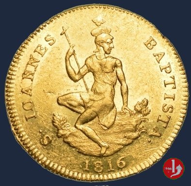 Verso: (da sinistra) S • IOANNES BAPTISTA • il Santo in figura giovanile, con nimbo circolare, seduto a sinistra su zolla erbosa, con la testa rivolta a sinistra, tiene con la sinistra lunga croce e la destra indica verso l'alto