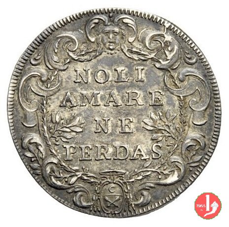 Verso: NOLI // AMARE // NE // PERDAS in cartella tonda chiusa in basso dall'armetta del Presidente delle Zecche mons. Farsetti.