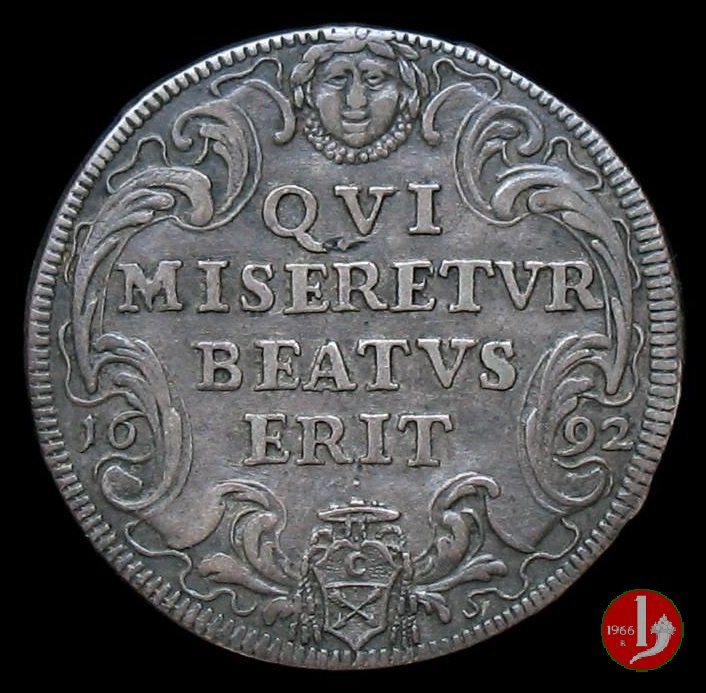 Verso: QVI // MISERETVR // BEATVS // ERIT in cartella a targa ovale chiusa in basso dall'armetta del Presidente delle Zecche mons. Farsetti.
