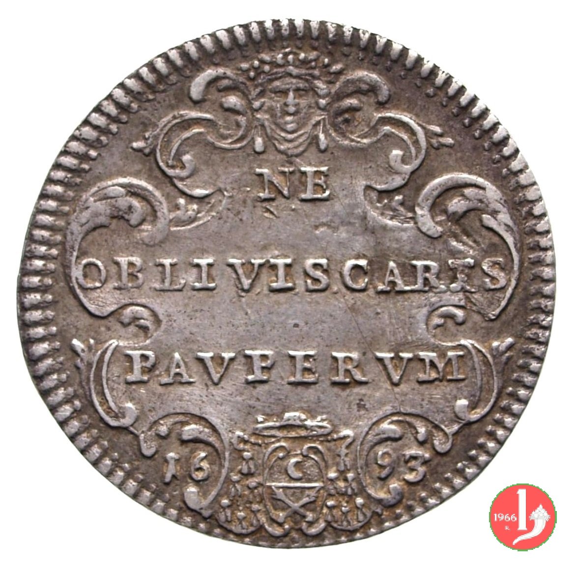 Verso: NE // OBLIVISCARIS // PAVPERVM in cartella sagomata chiusa in basso dall'armetta del Presidente delle Zecche mons. Farsetti. Millesimo in basso.