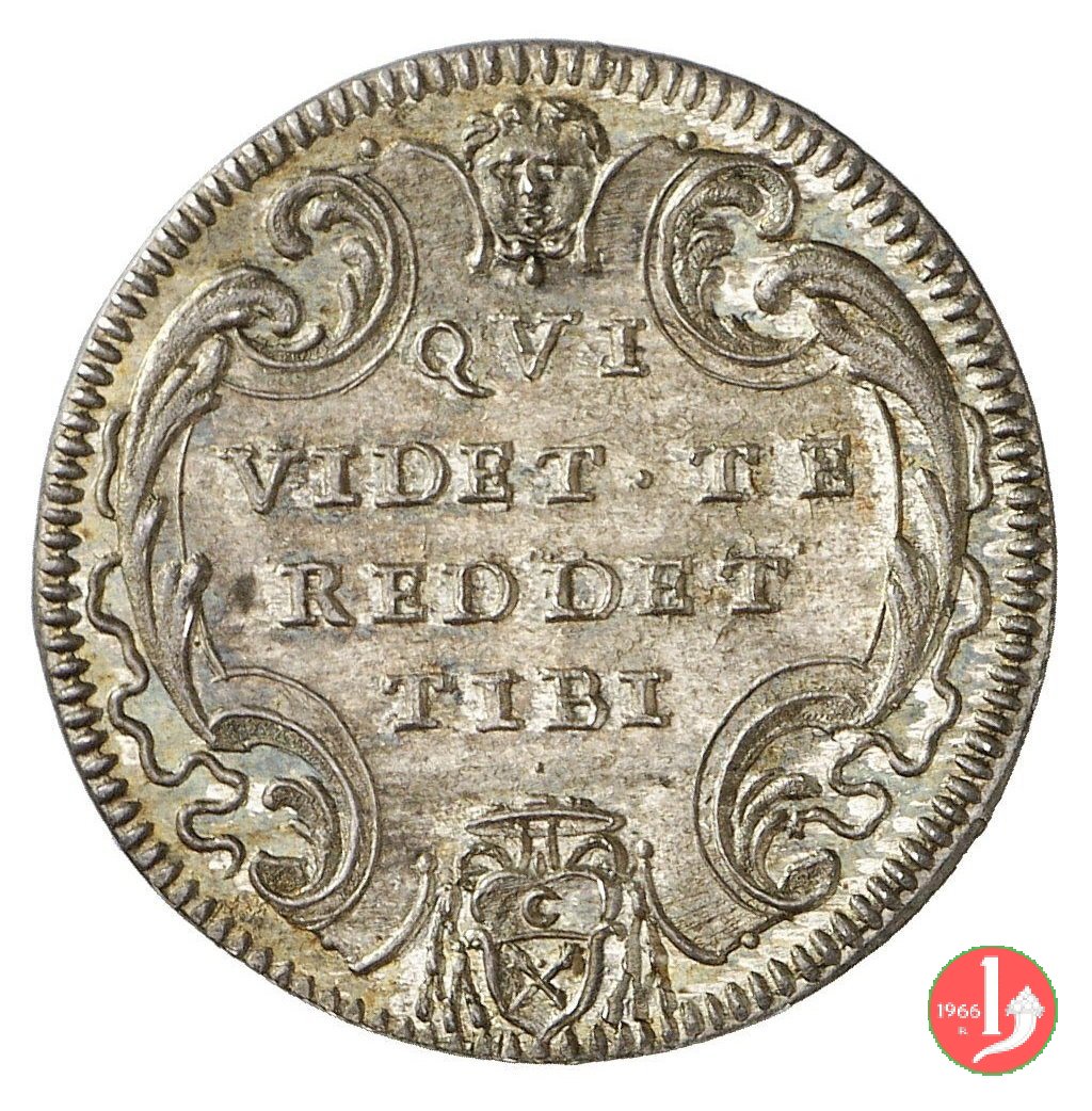Verso: QVI // VIDET • TE // REDDET TIBI in cartella sagomata chiusa in basso dall'armetta del Presidente delle Zecche mons. Farsetti.