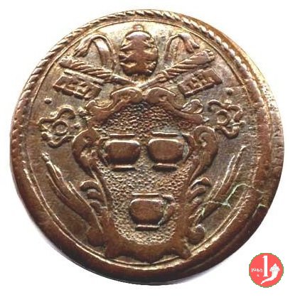Dritto: Stemma oblungo con fogliami, tiara radiante; chiavi con impugnatura ovale, con cordoni e fiocchi.