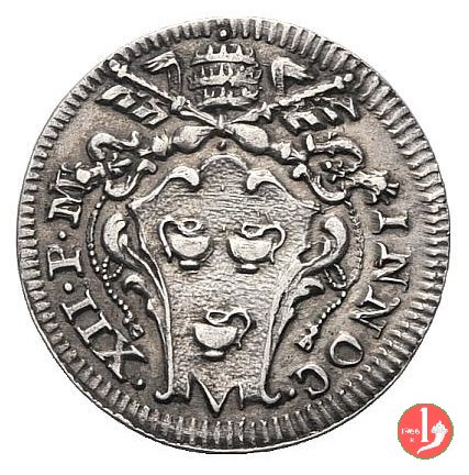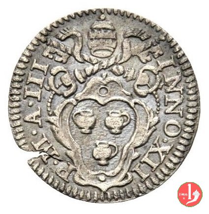 Dritto: Stemma ovale sagomato in cornice con rali di palma ai lati, chiavi con impugnatura ovale, con cordoni e fiocchi; legenda da SX: stella a 6 punte CLEMENS stella a 6 punte XI - P stella a 6 punte M stella a 6 punte AN stella a 6 punte XIII stella a 6 punte