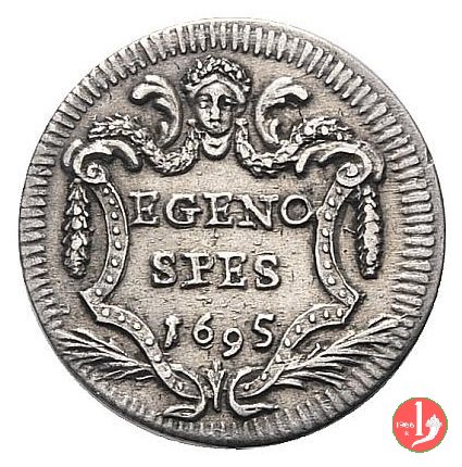 Verso: EGENO // SPES // millesimo, in cartella poligonale con testina in cimasa.