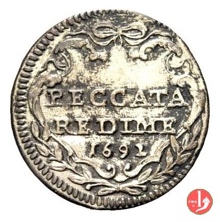 Verso: PECCATA // REDIME // millesimo, in cartella tra due rami d'ulivo.