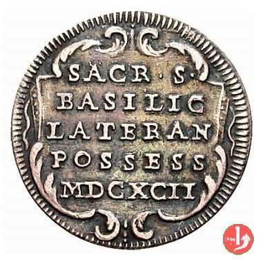 Verso: Stemma trilobato con fogliami, chiavi con impugnatura ovale intagliata, cordoni e fiocchi; legenda da SX: • CLEMENS • XI • - • P • M • A • XII •