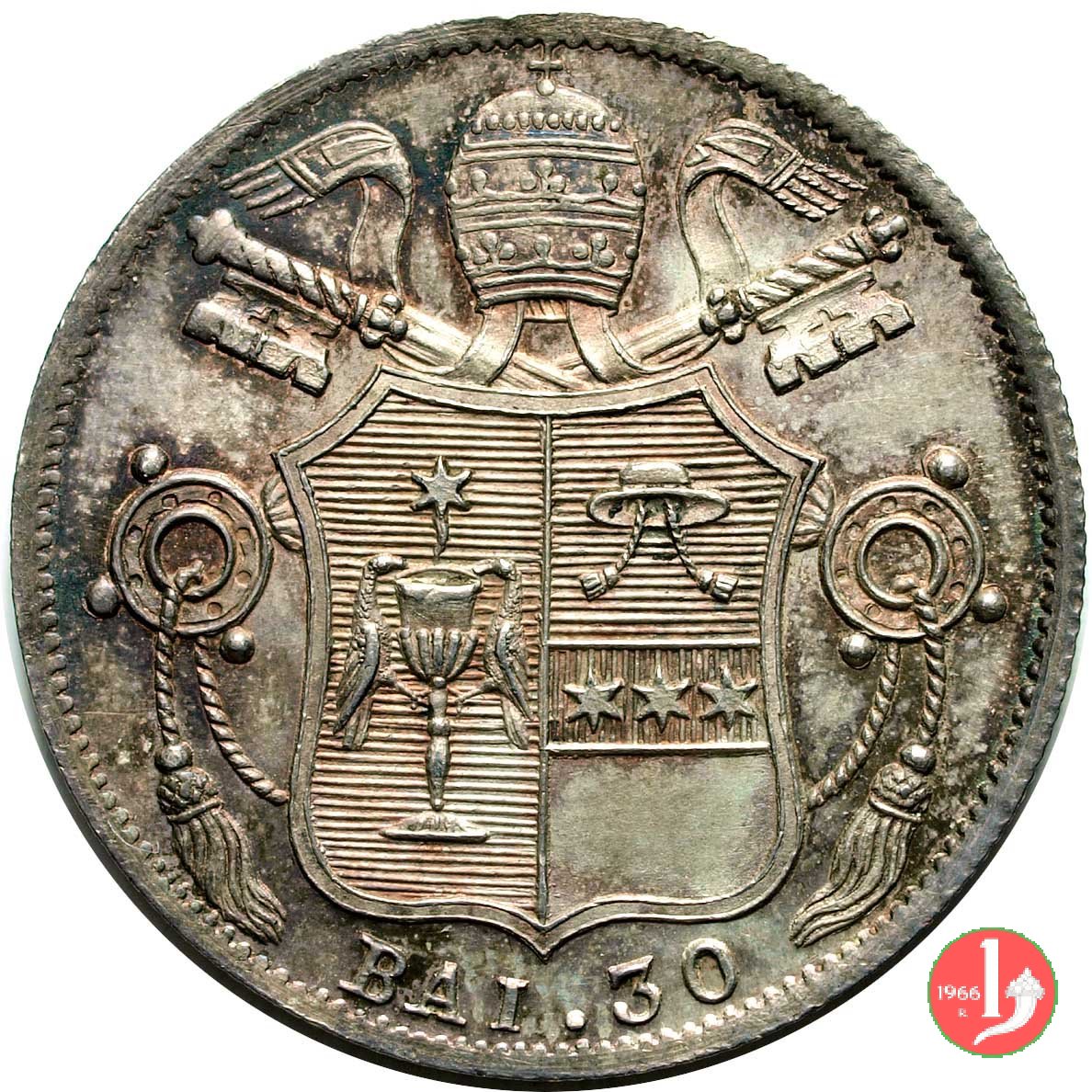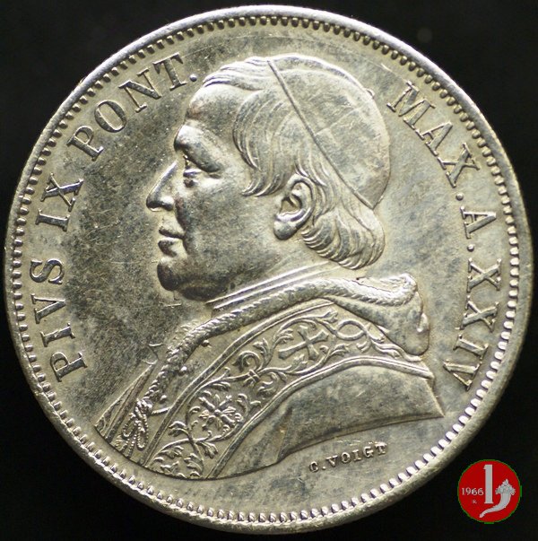 Dritto: Nel campo, busto a sinistra con zucchetta di Pio IX con sotto l'indicazione dell'autore (G • VOIGT). Intorno PIVS IX PONT • MAX • A • e anno di pontificato.