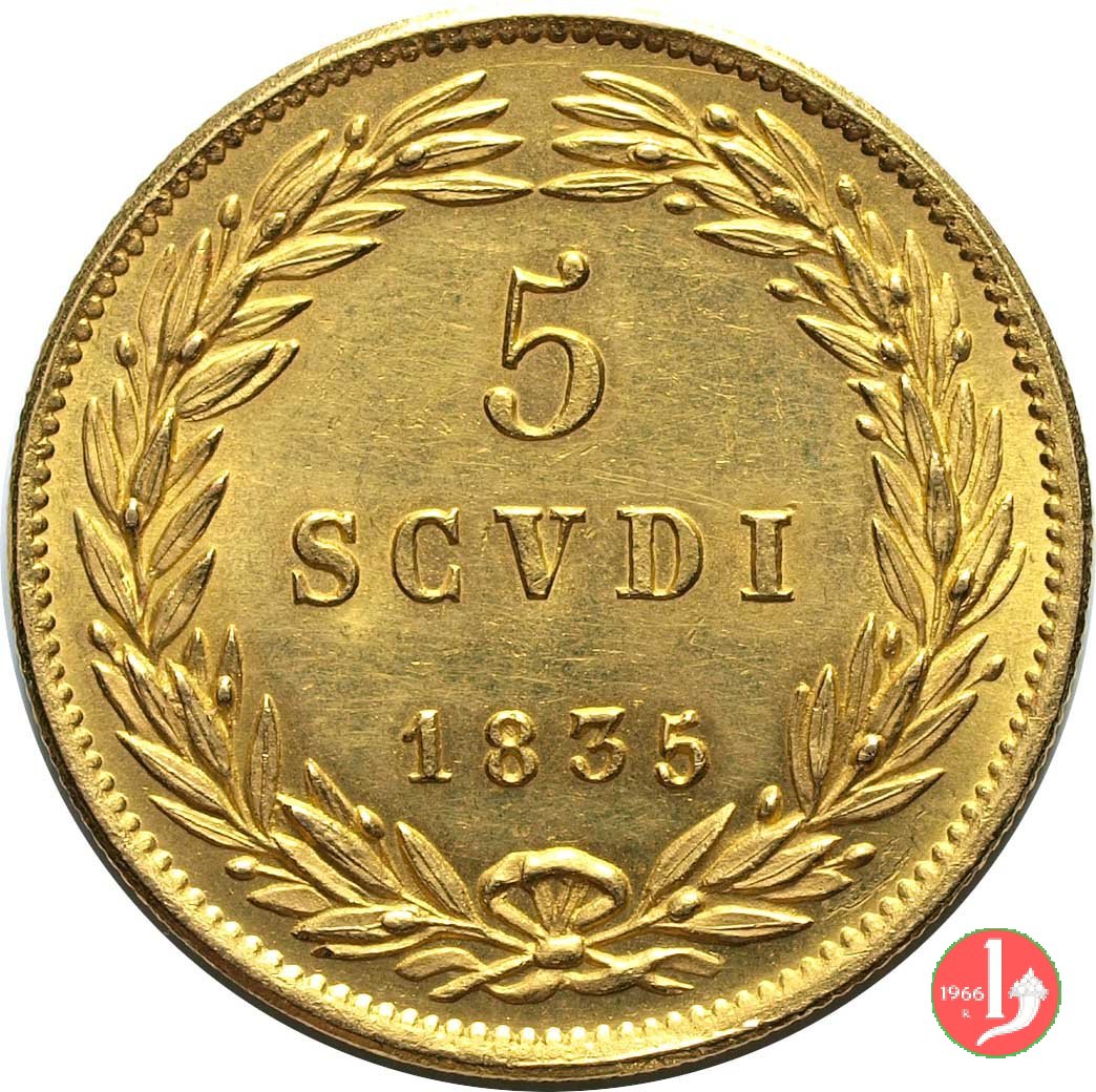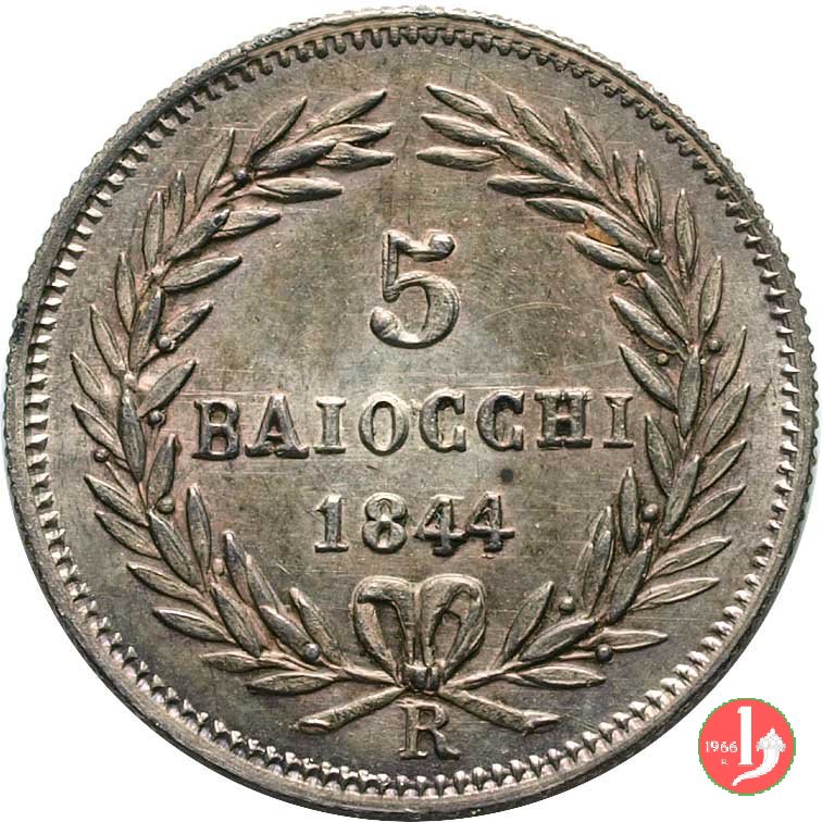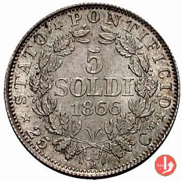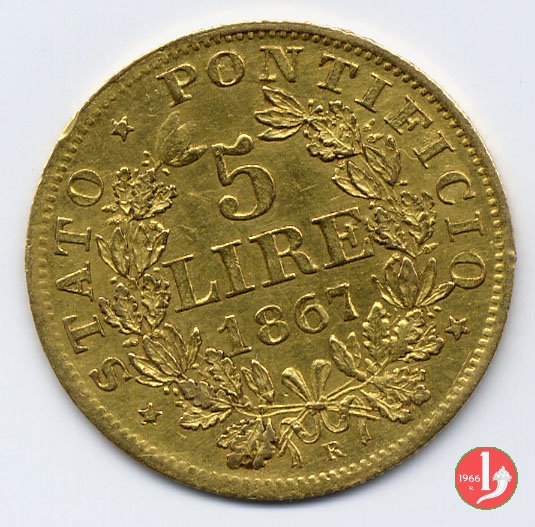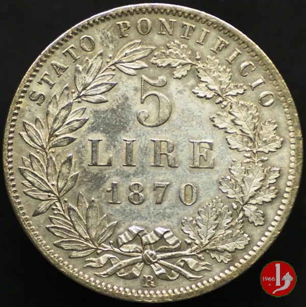 Verso: Valore (5 LIRE) e millesimo su tre righe tra due rami di lauro e quercia incrociati in basso con fiocco. Intorno, nella parte superiore, STATO PONTIFICIO, in basso segno di zecca (R).