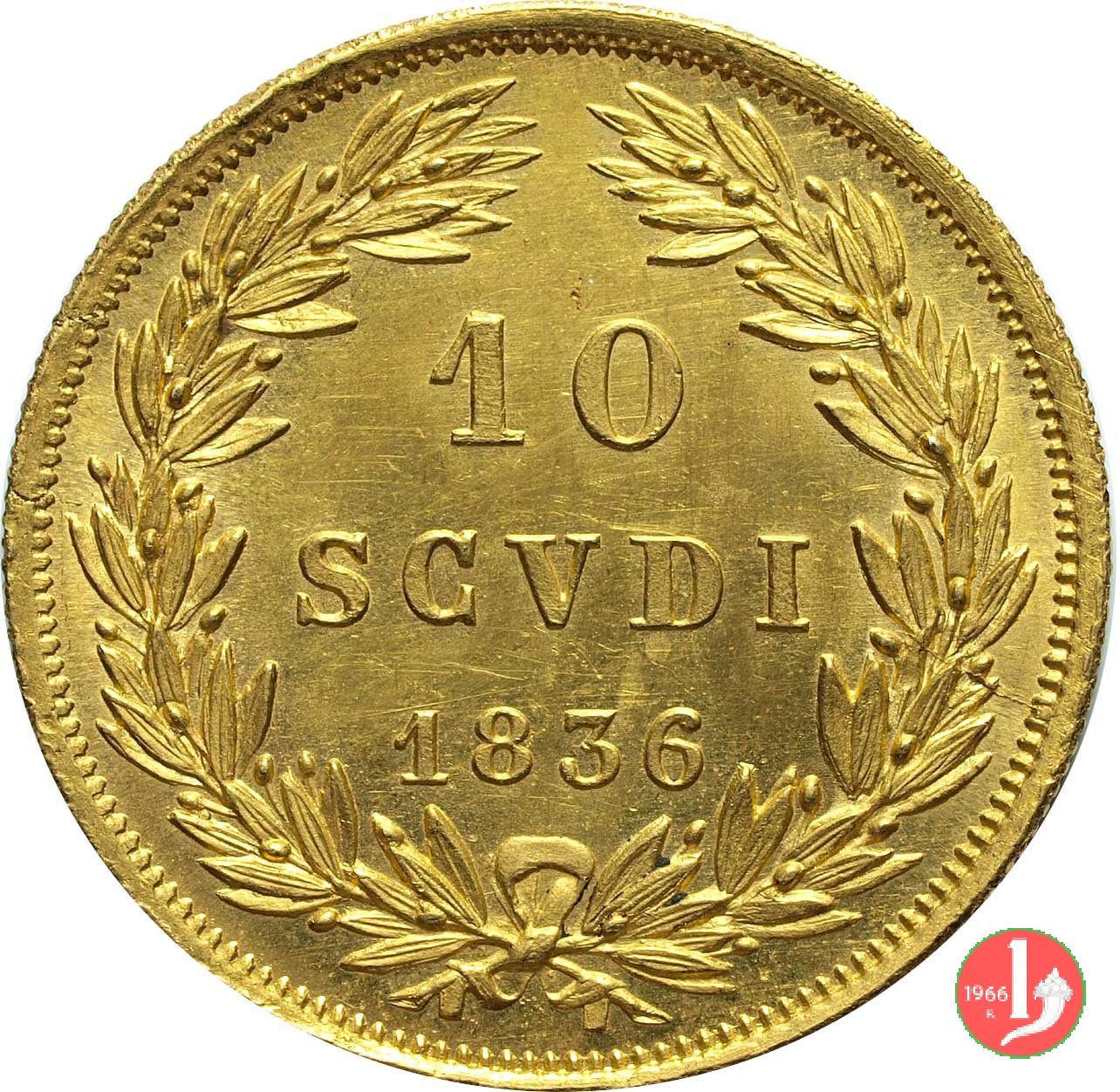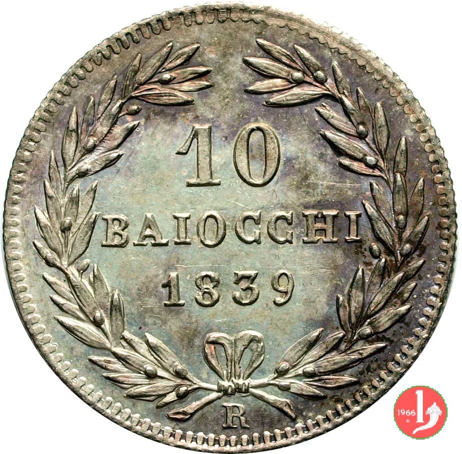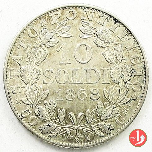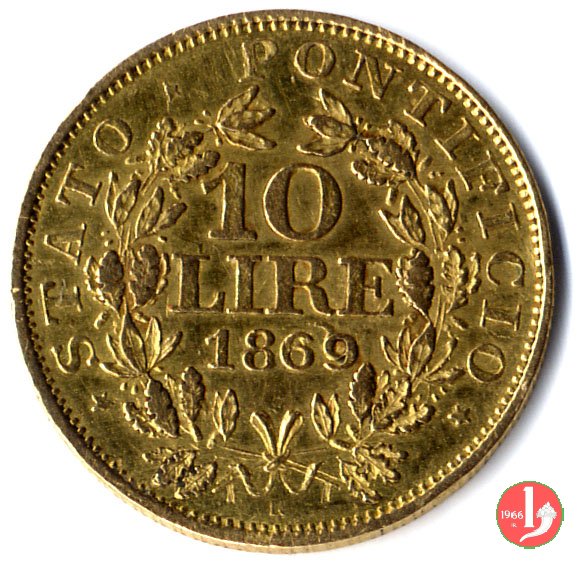 Verso: Valore (10 LIRE) e millesimo su tre righe tra due rami di lauro e quercia incrociati in basso. Intorno STATO PONTIFICIO tra 3 stellette a 5 punte. In basso segno di zecca (R).