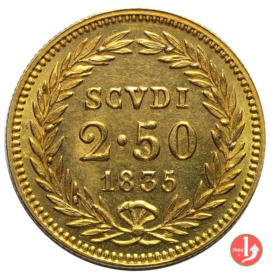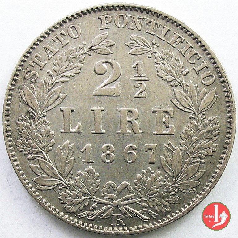 Verso: Valore (2 1/2 LIRE) e millesimo su tre righe tra due rami di lauro e quercia incrociati in basso. Intorno nella parte superiore STATO PONTIFICIO e in basso segno di zecca (R).