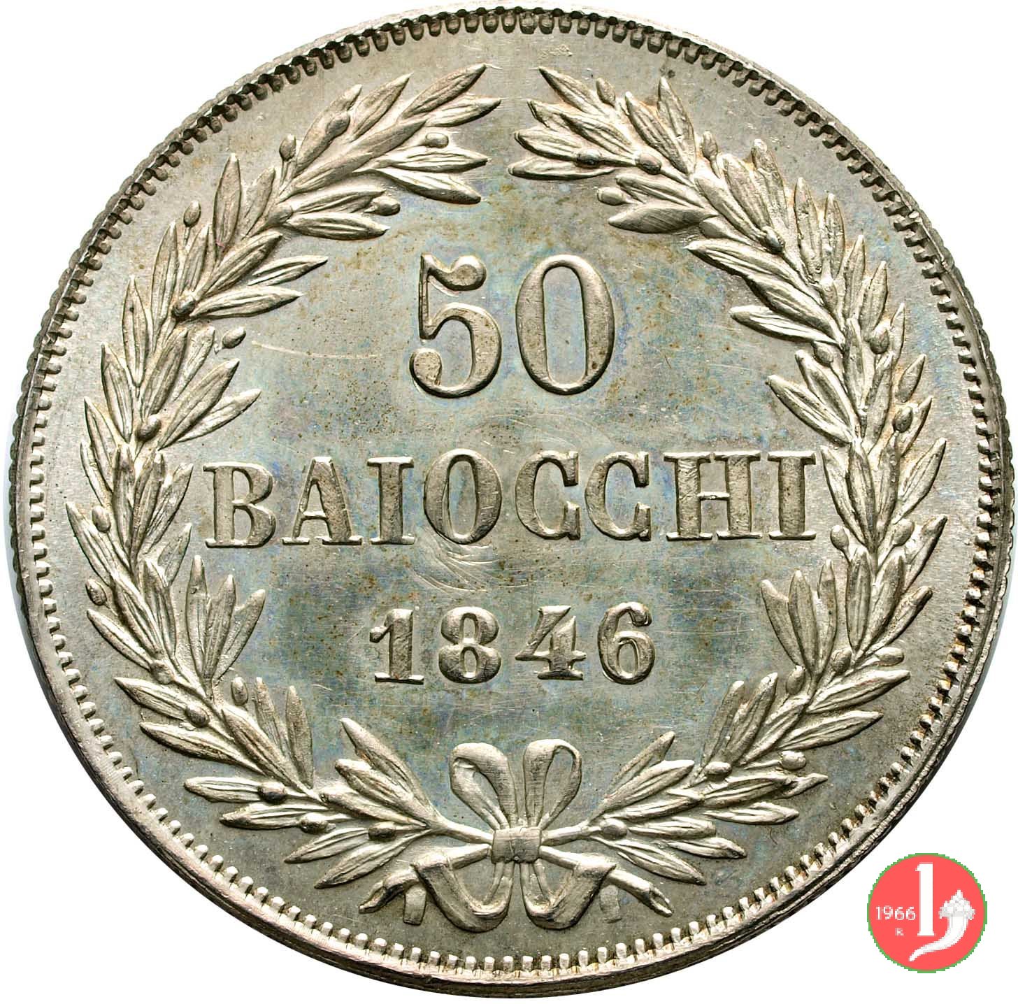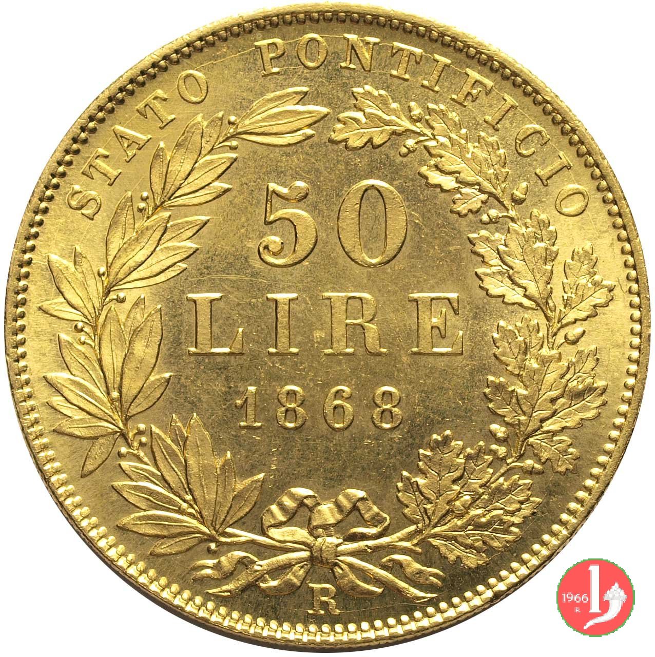 Verso: Valore (50 LIRE) e millesimo su tre righe tra due rami di lauro e quercia incrociati in basso. Nella parte superiore, lungo il bordo, STATO PONTIFICIO. In basso segno di zecca (R).
