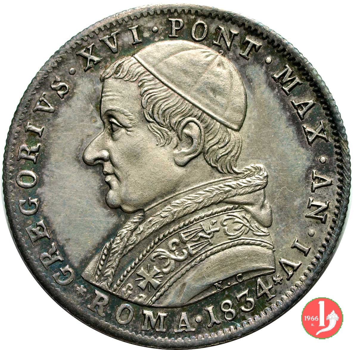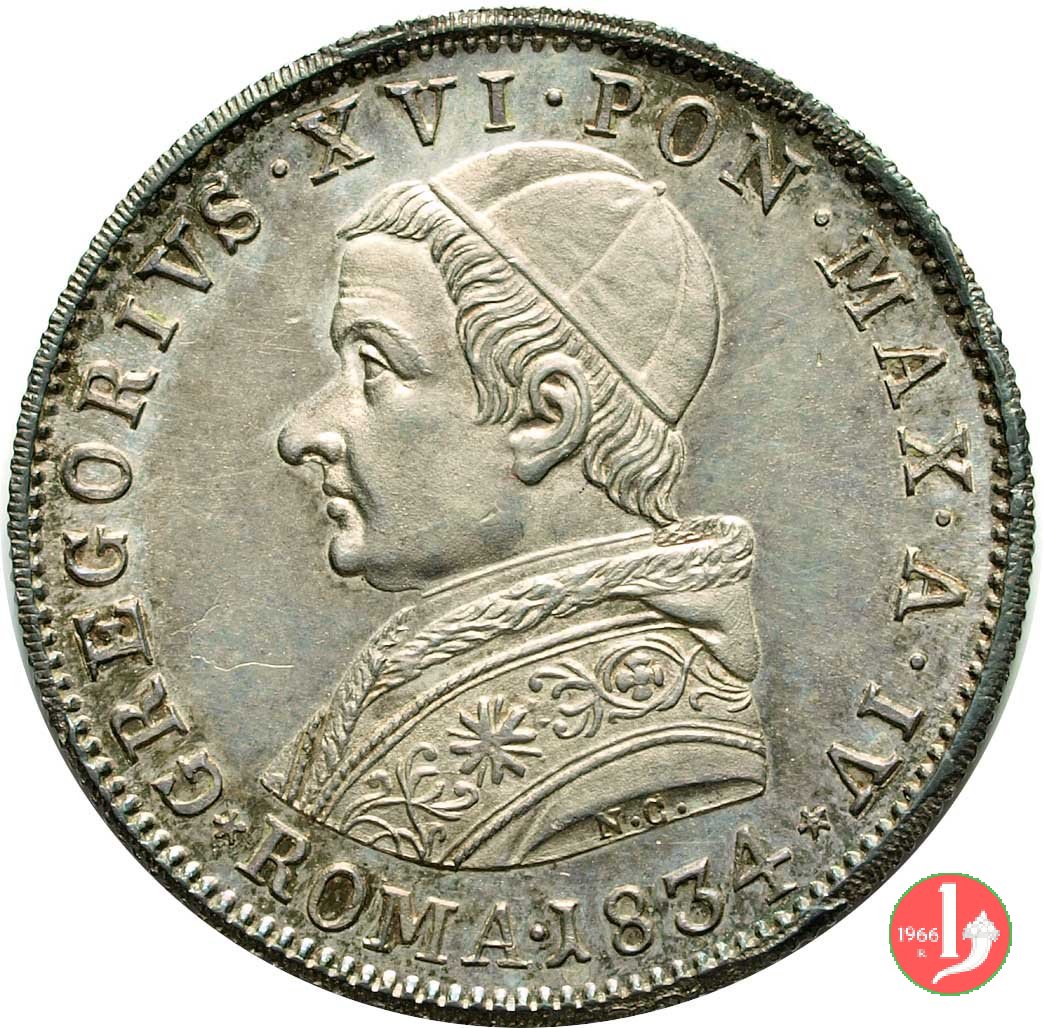 Dritto: GREGORIVS • XVI • PON • MAX • AN • IV busto a sinistra con zucchetto, mozzetta e stola con rosetta, croce radiante e rabeschi; nel troncato della spalla N. C. (Nicola Cerbara, incisore); in basso, nel giro, tra due stellette ROMA•1834