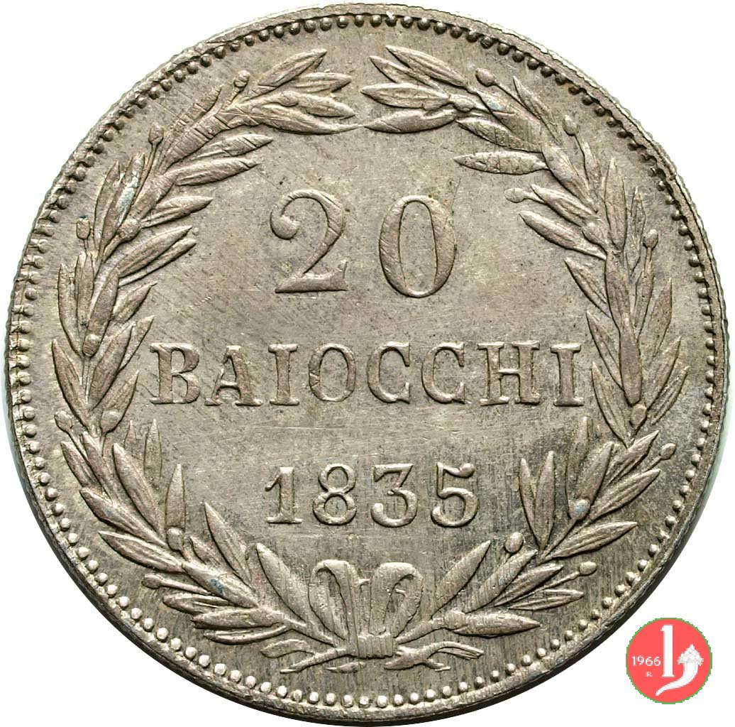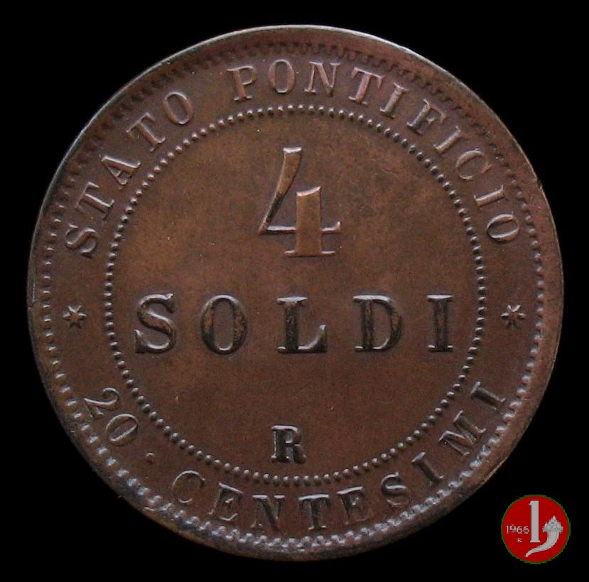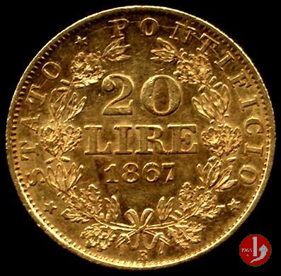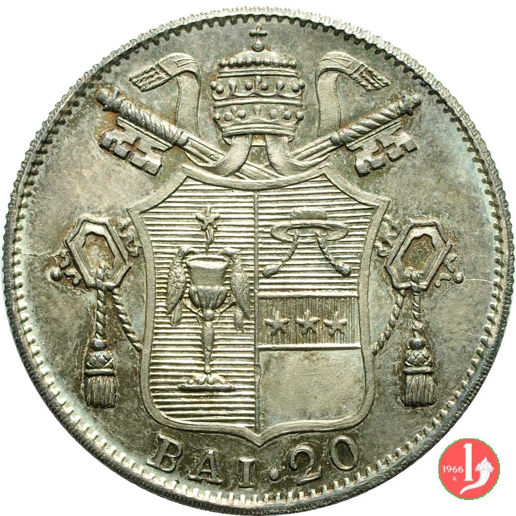 Verso: Valore (20 LIRE) e millesimo su tre righe tra due rami di lauro e quercia incrociati in basso. Intorno STATO PONTIFICIO tra 3 stellette a 5 punte. In basso segno di zecca (R).